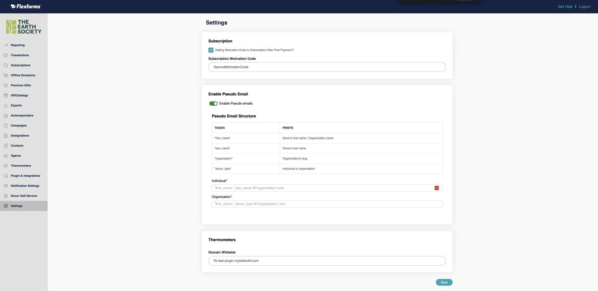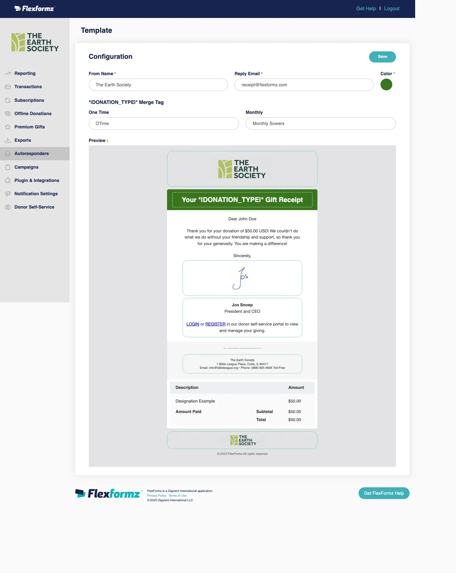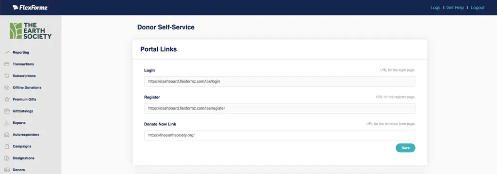 On the Portal Links Section, conveniently set your “Donate Now Link” to a FlexFormz Donation Form on your website. It will be displayed as a button on the sidebar of the Donor Self-Service portal.