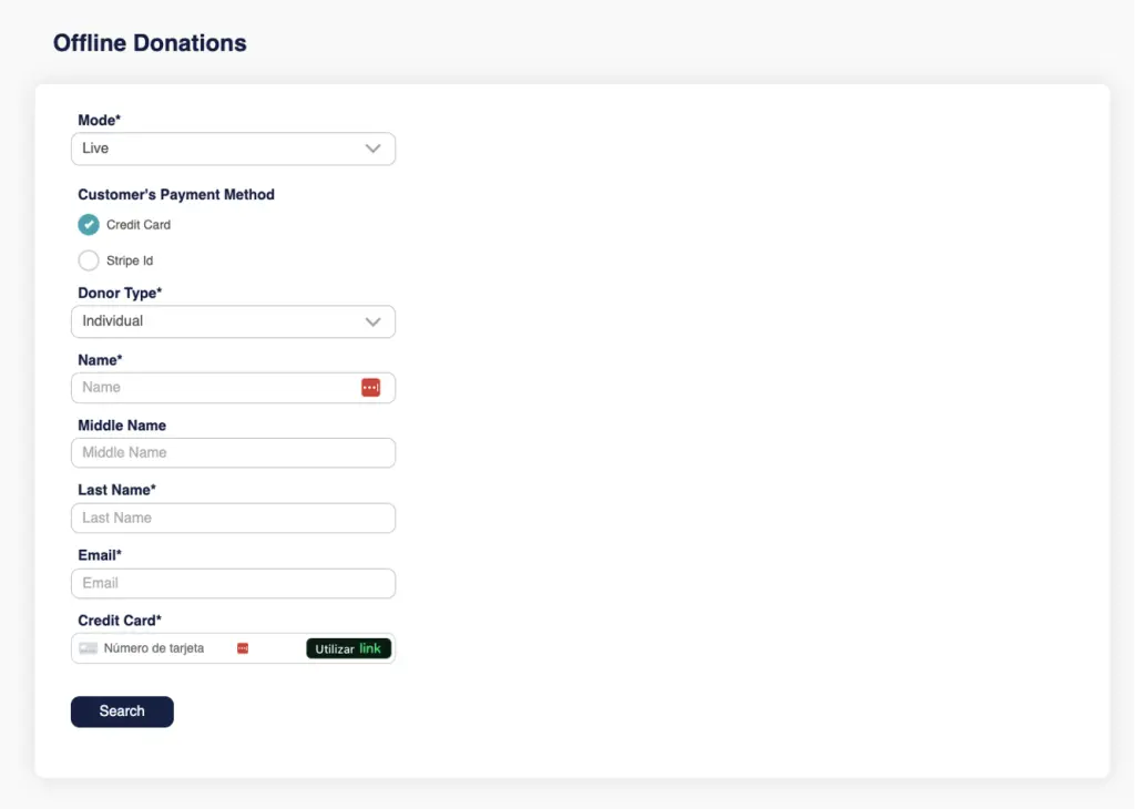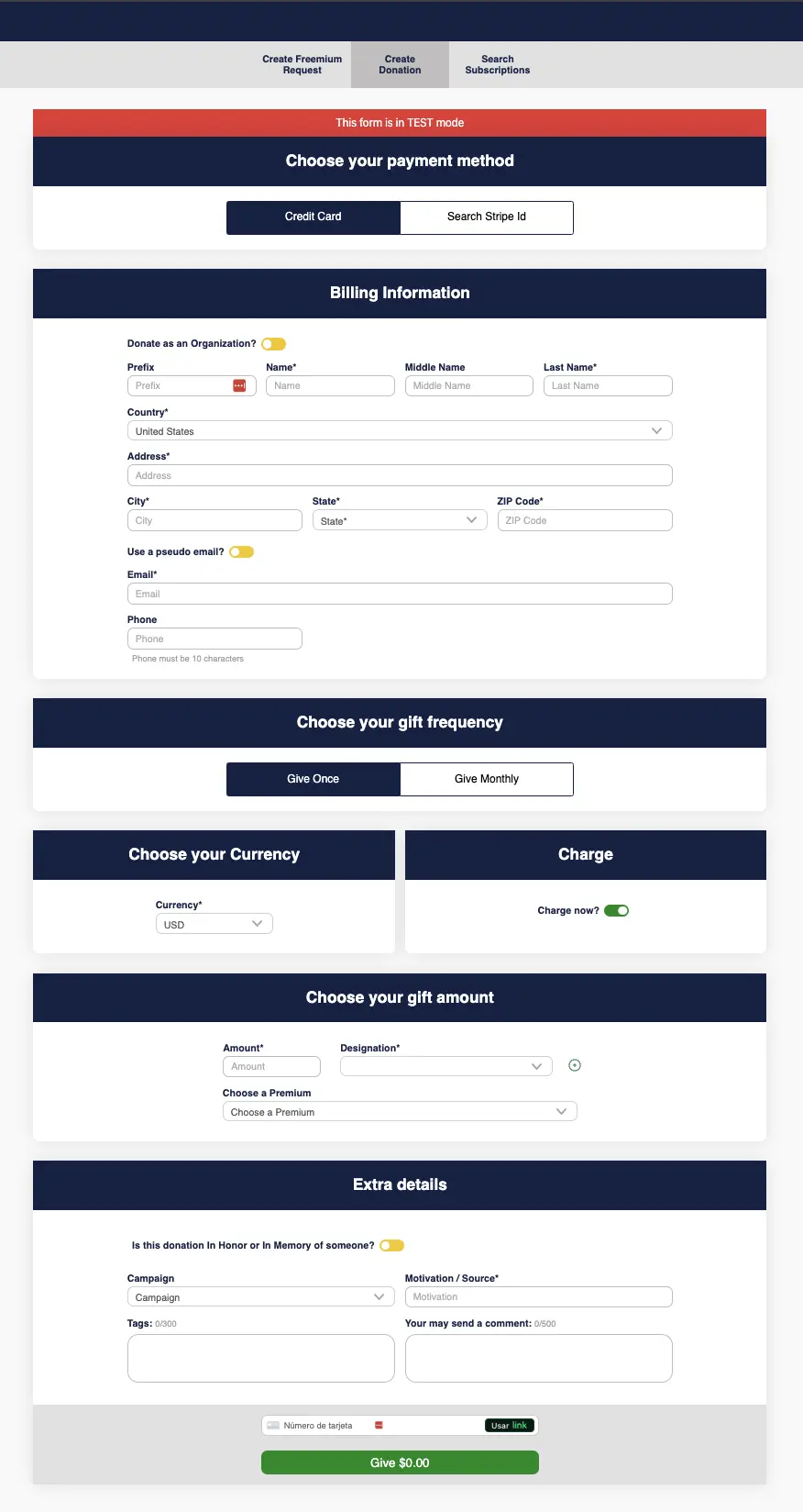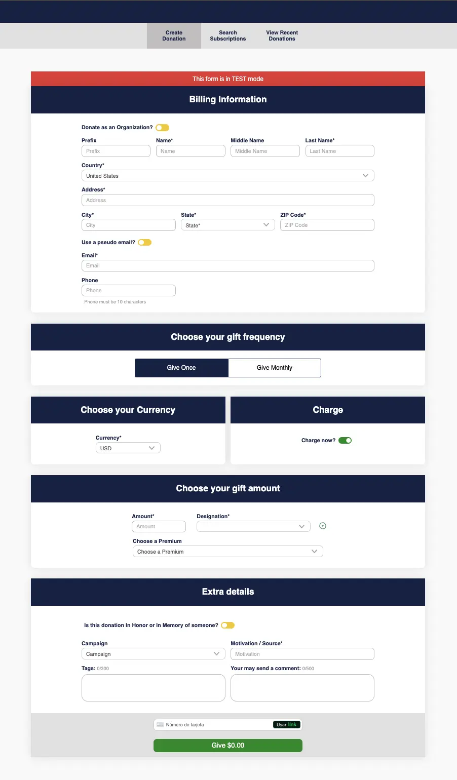 - Create Donation submenu has a form very similar to the one-column form with the following differences: They can use a pseudo email generated with the donor’s information, they can schedule the charge to be in the future and the only payment type allowed is a credit card.