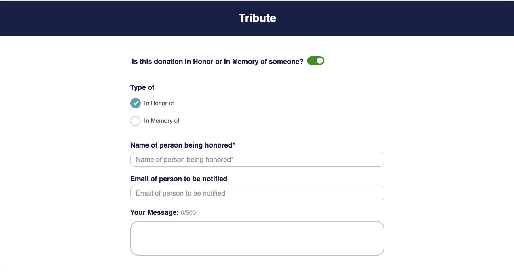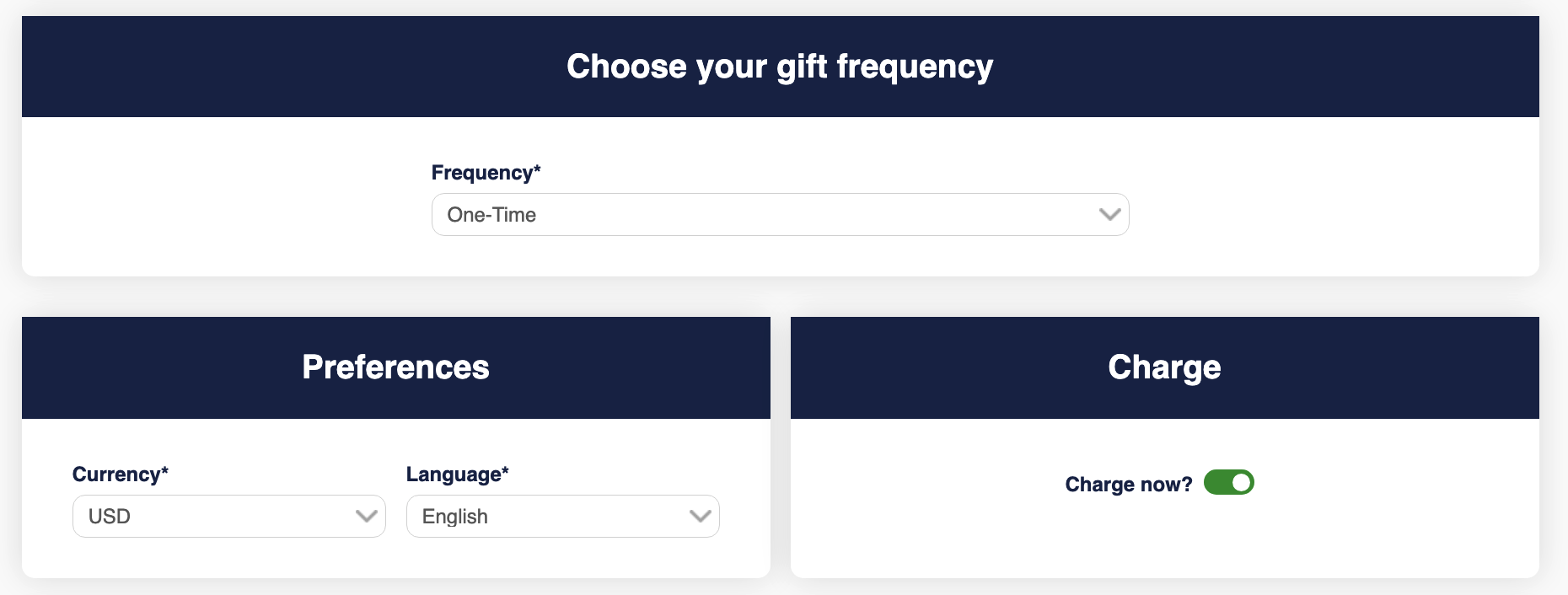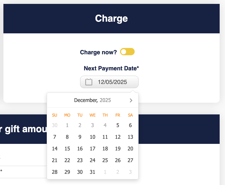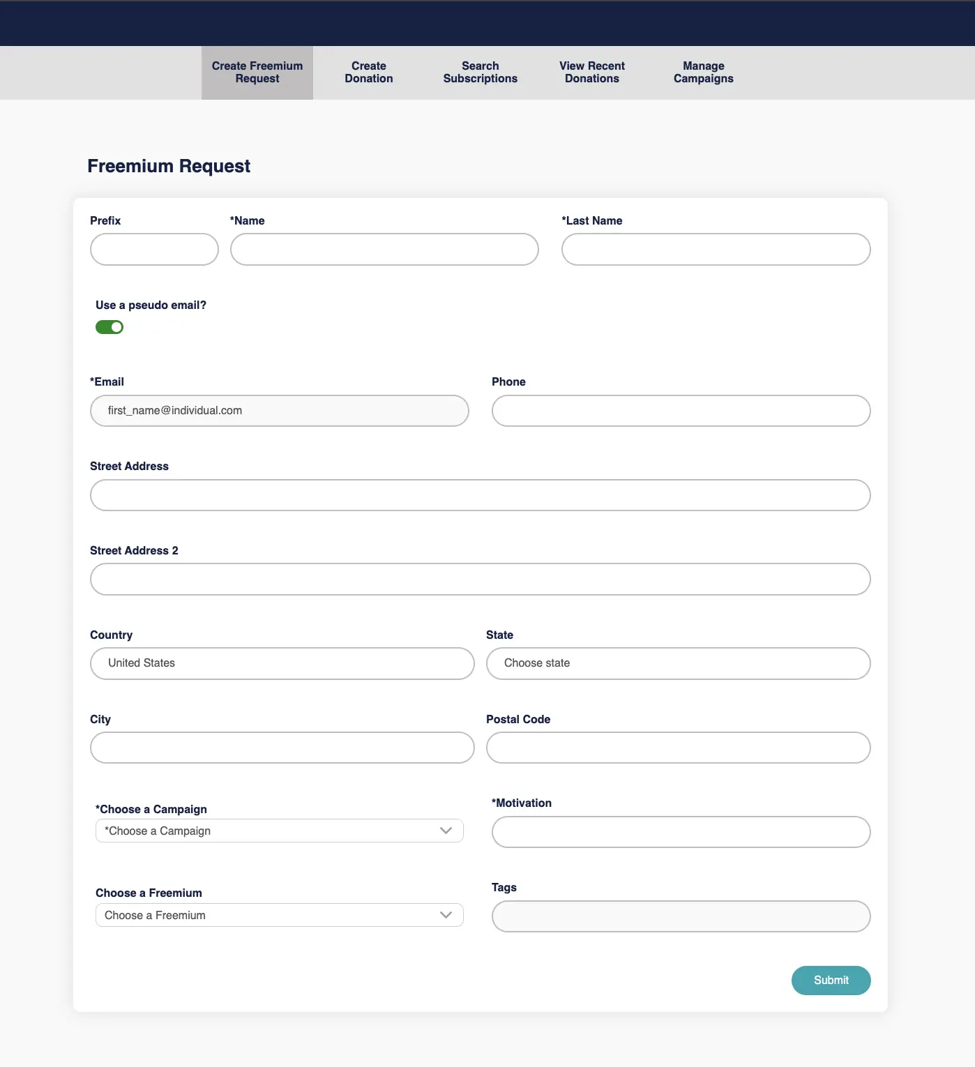 - Create Donation submenu has a form very similar to the one-column form with the following differences: They can use a pseudo email generated with the donor’s information, they can schedule the charge to be in the future and the only payment type allowed is a credit card.
