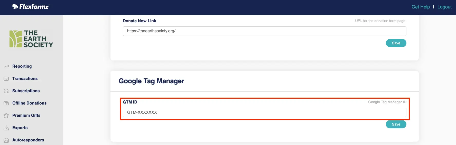 Below the Portal Links section, you can add your Google Tag Manager ID, which needs to have a GT-XXXXXXXXX format. It will add functionalities to the Donor Self-Service portal, such as changing the colors according to your brand, adding a chatbot, or injecting another CSS or Javascript code, depending on your needs.