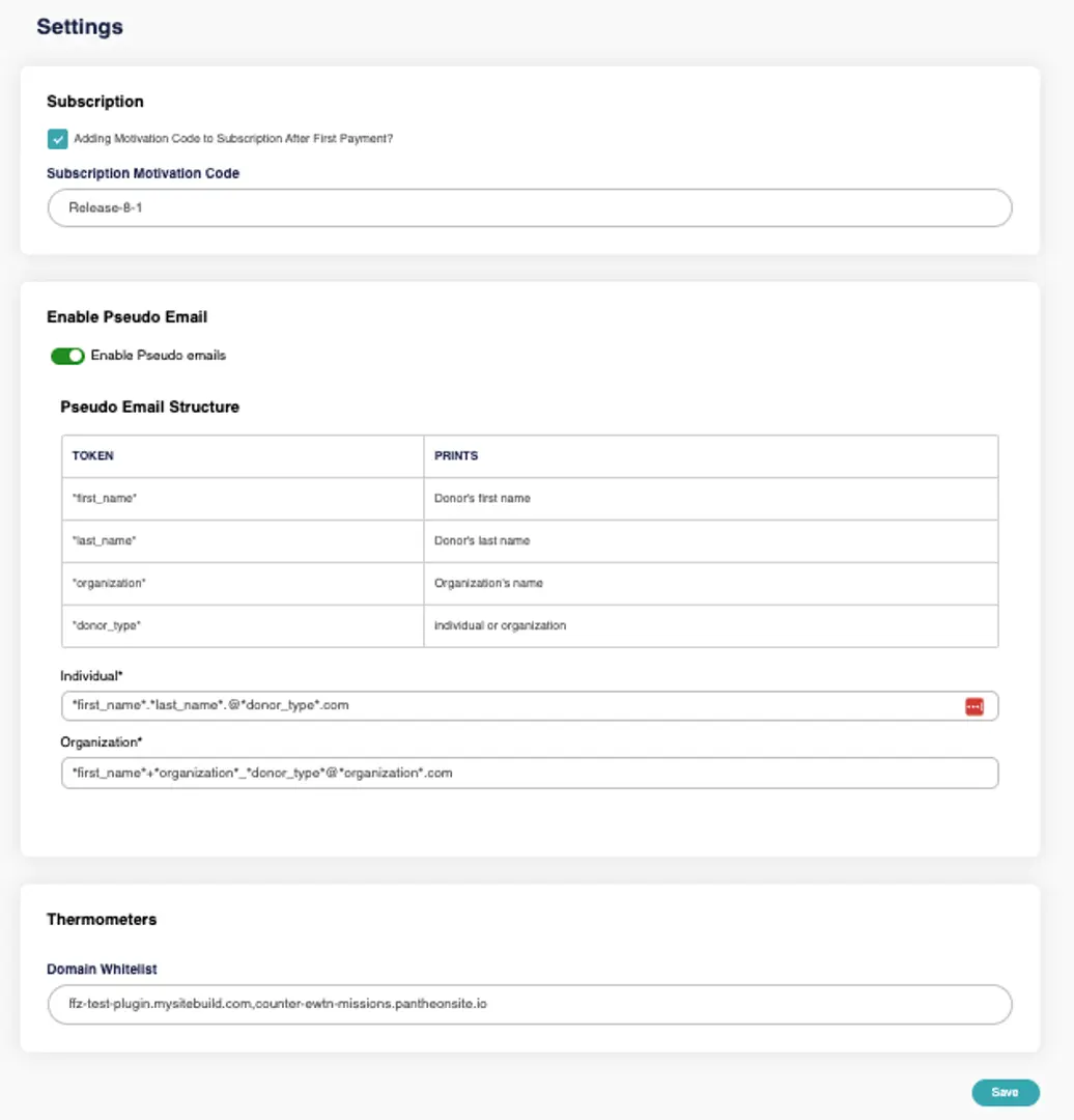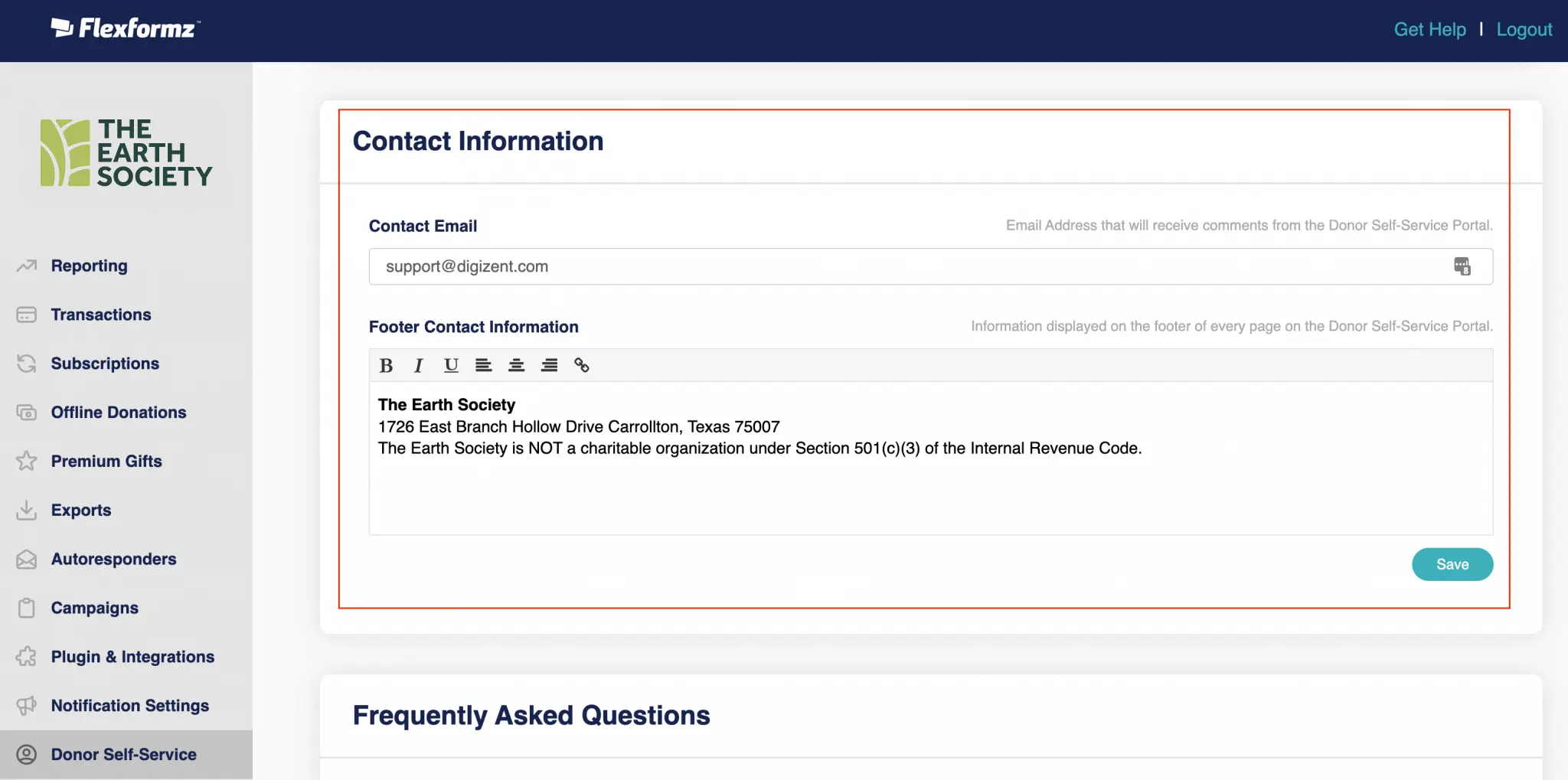 Here you can add a Contact Email for your donor to contact your organization if they have any issues and it is displayed on the sidebar of the donor self-service portal. The Footer Contact Information is displayed on the footer of every page on the donor self-service portal.
