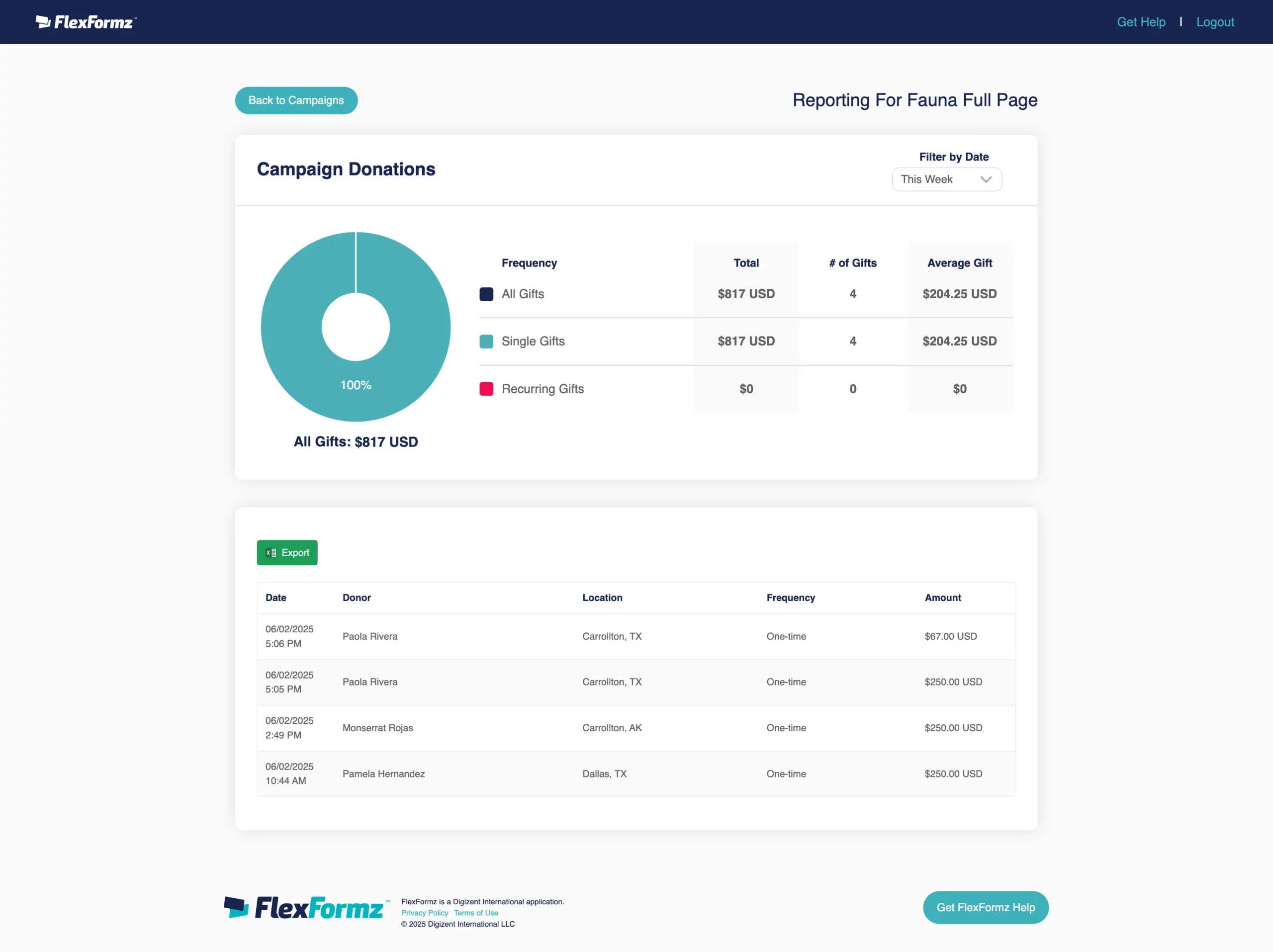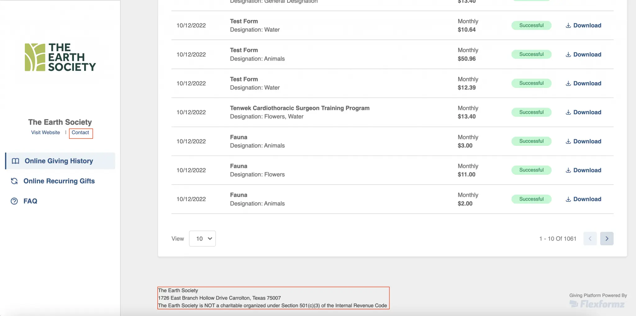 The donor can view all registered CRM donations they have made in the past (even if they are not made with FlexFormz) in the “All Giving History” Section. Please note that these donations are purely for informational purposes and cannot be canceled or modified. For now, DonorDirect is the only supported CRM and must be connected and active; otherwise, the donor cannot view this feature.