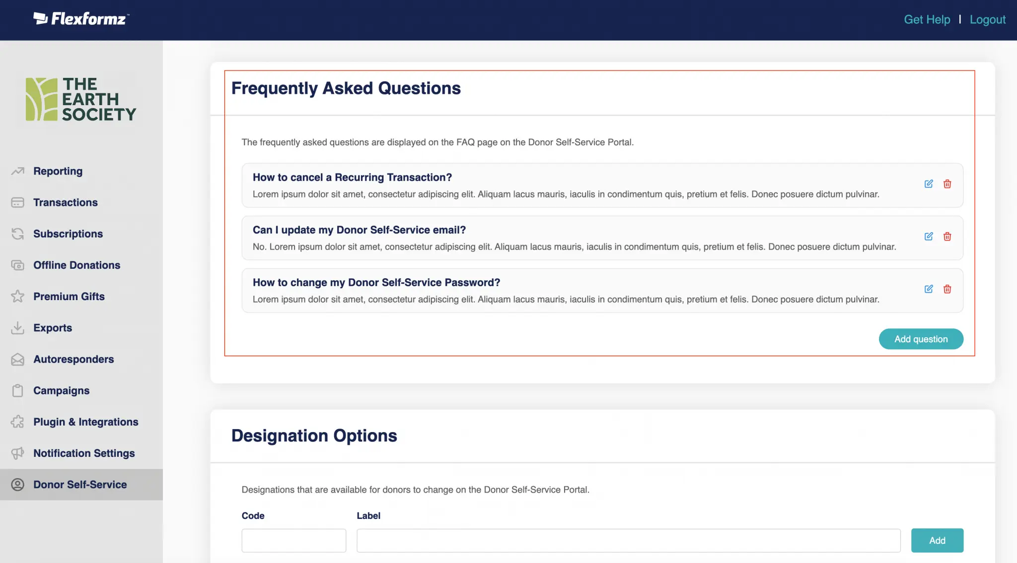 On the donor self-service settings, you may add Frequently Asked Questions that will be displayed on the donor self-service portal. Click on the “Add question” button. On the popup write your question and answer and then click the “Save” button to add a new question.