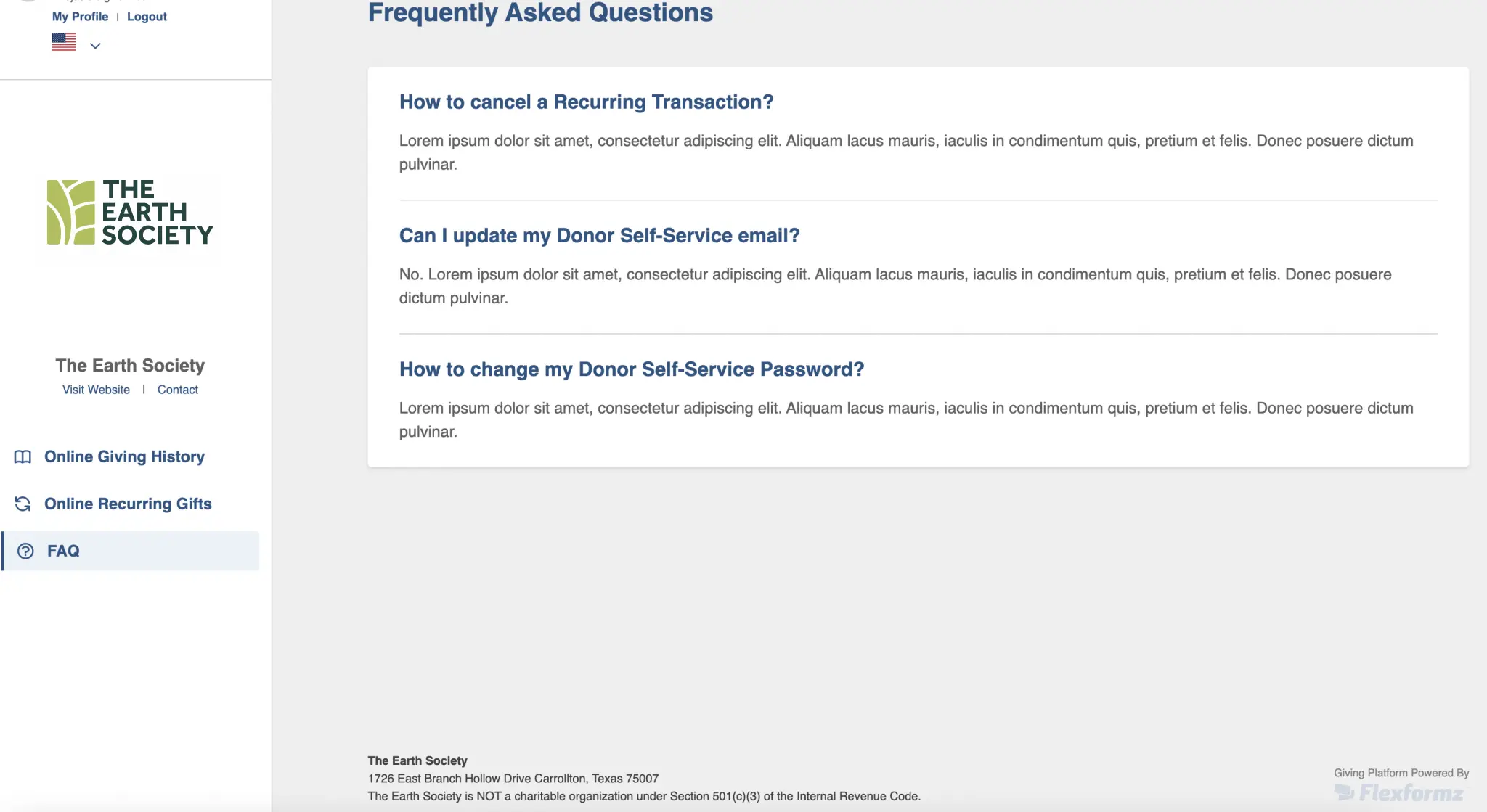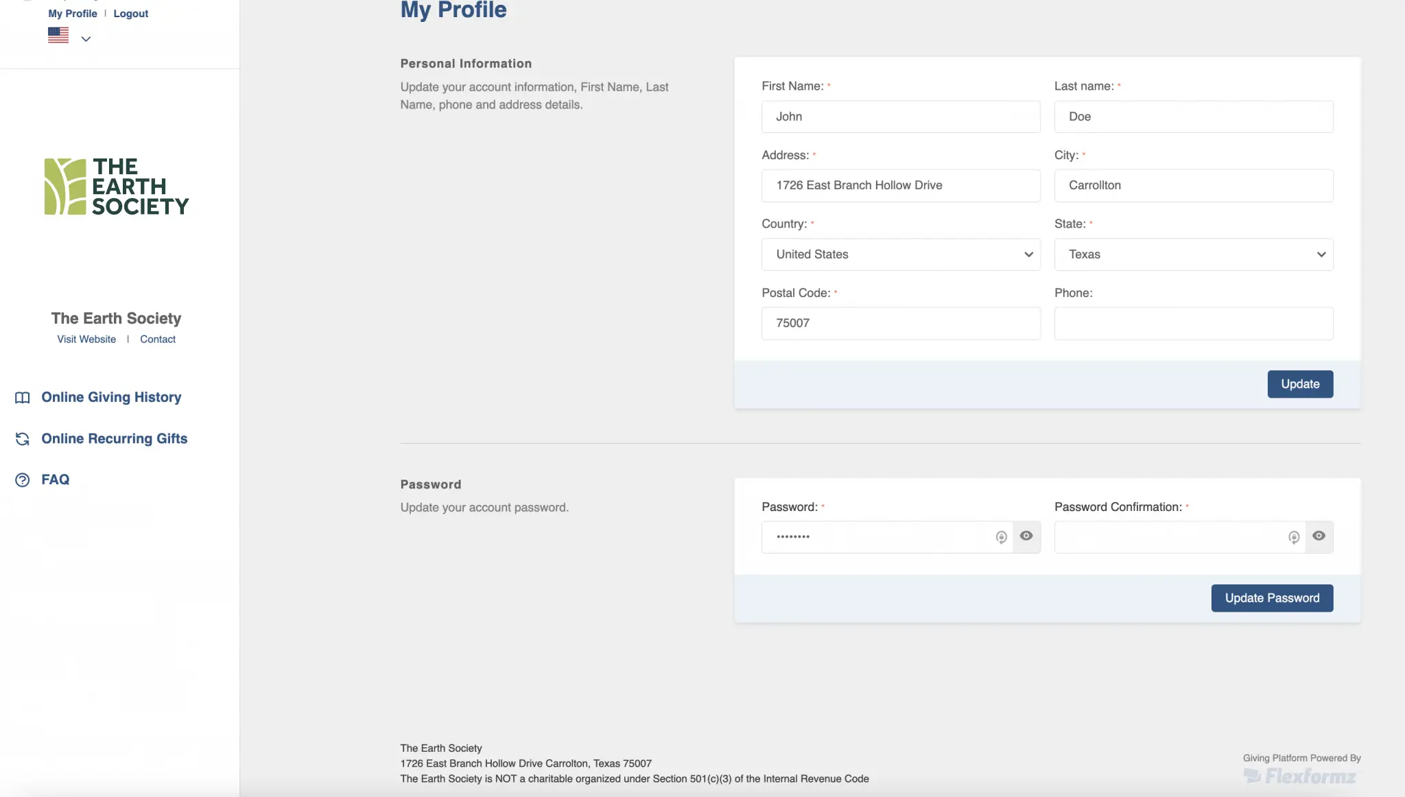 The donor can update their profile information by clicking on the “My Profile” link at the top left corner. In this section, the donor can update their name and address information, as well as change the password for their account. The email CANNOT be updated as it is used as an identifier on FlexFormz and your CRM.