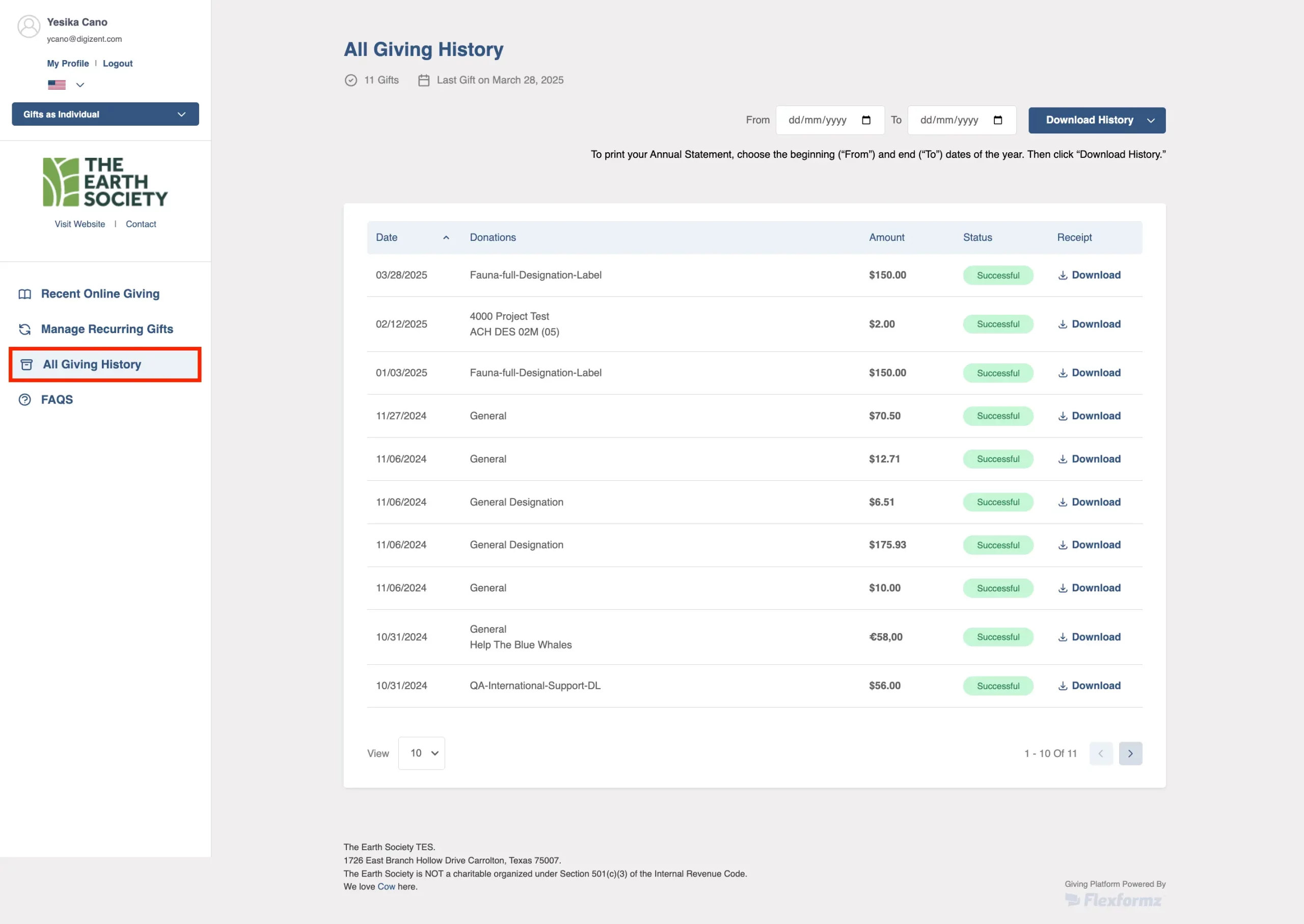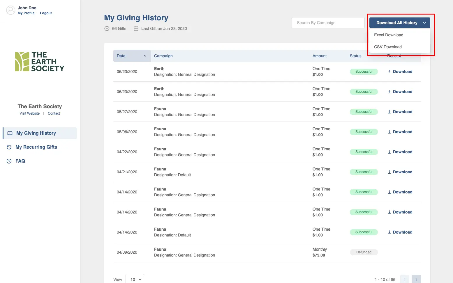 On the donor self-service portal, the donor can view their giving history and download individual receipts of each transaction. They can also download all of their giving history by clicking the “Download All History” at the top right corner of the page.