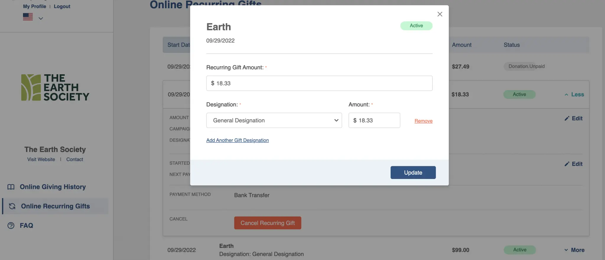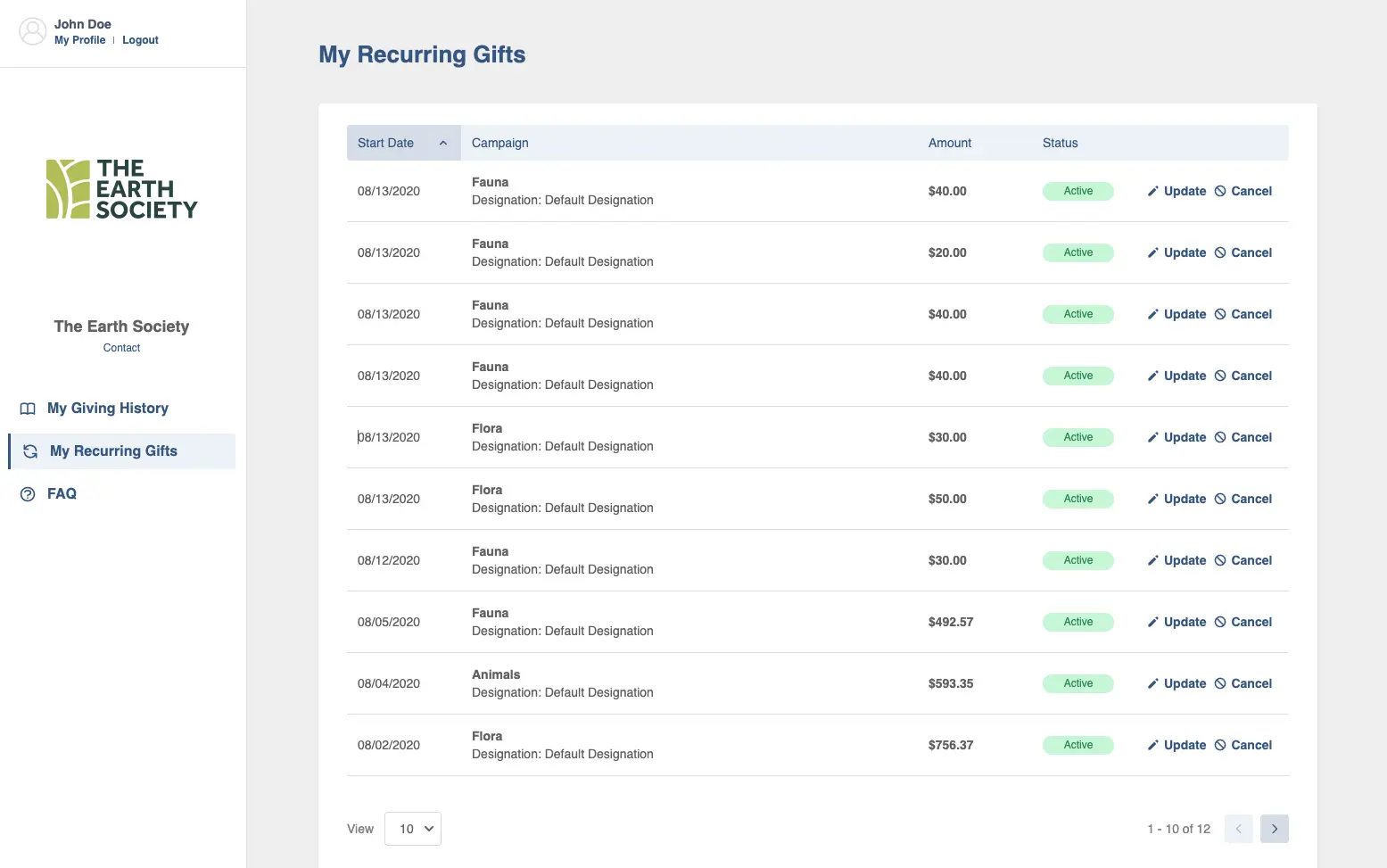 On the “My Recurring Gifts” section all recurring donations are listed. If a donation is active the donor can update or cancel the gift.