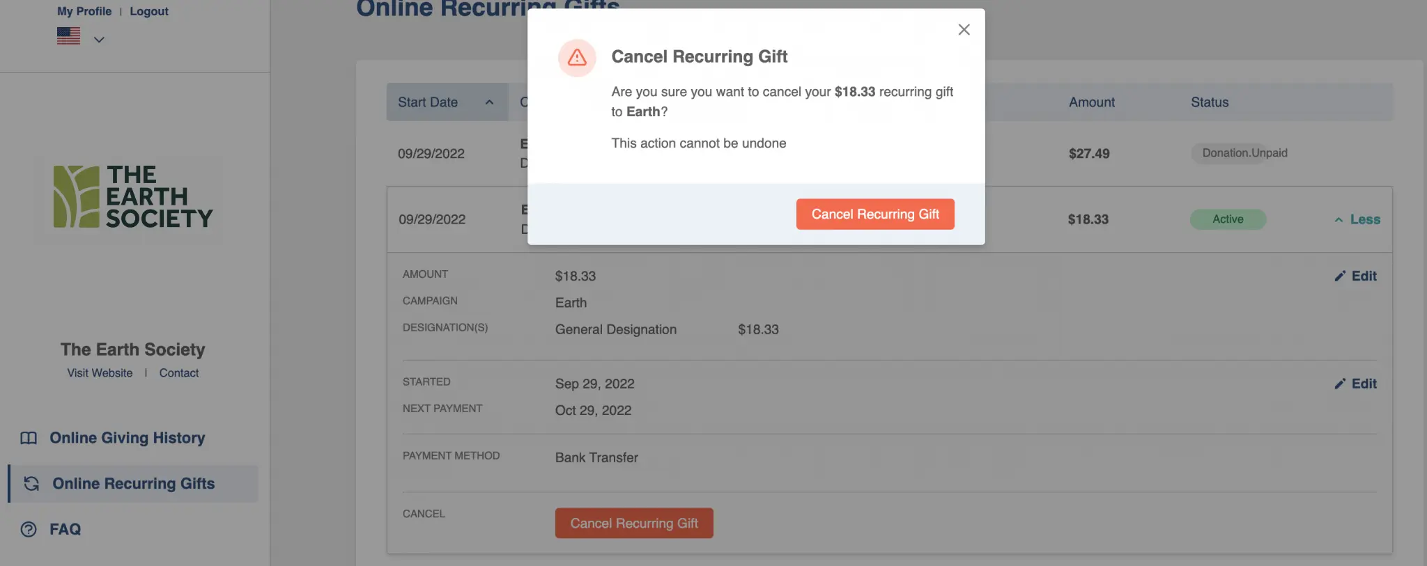 A recurring gift can be canceled by clicking the “Cancel” button at the right of the gift, a confirmation lightbox will appear.