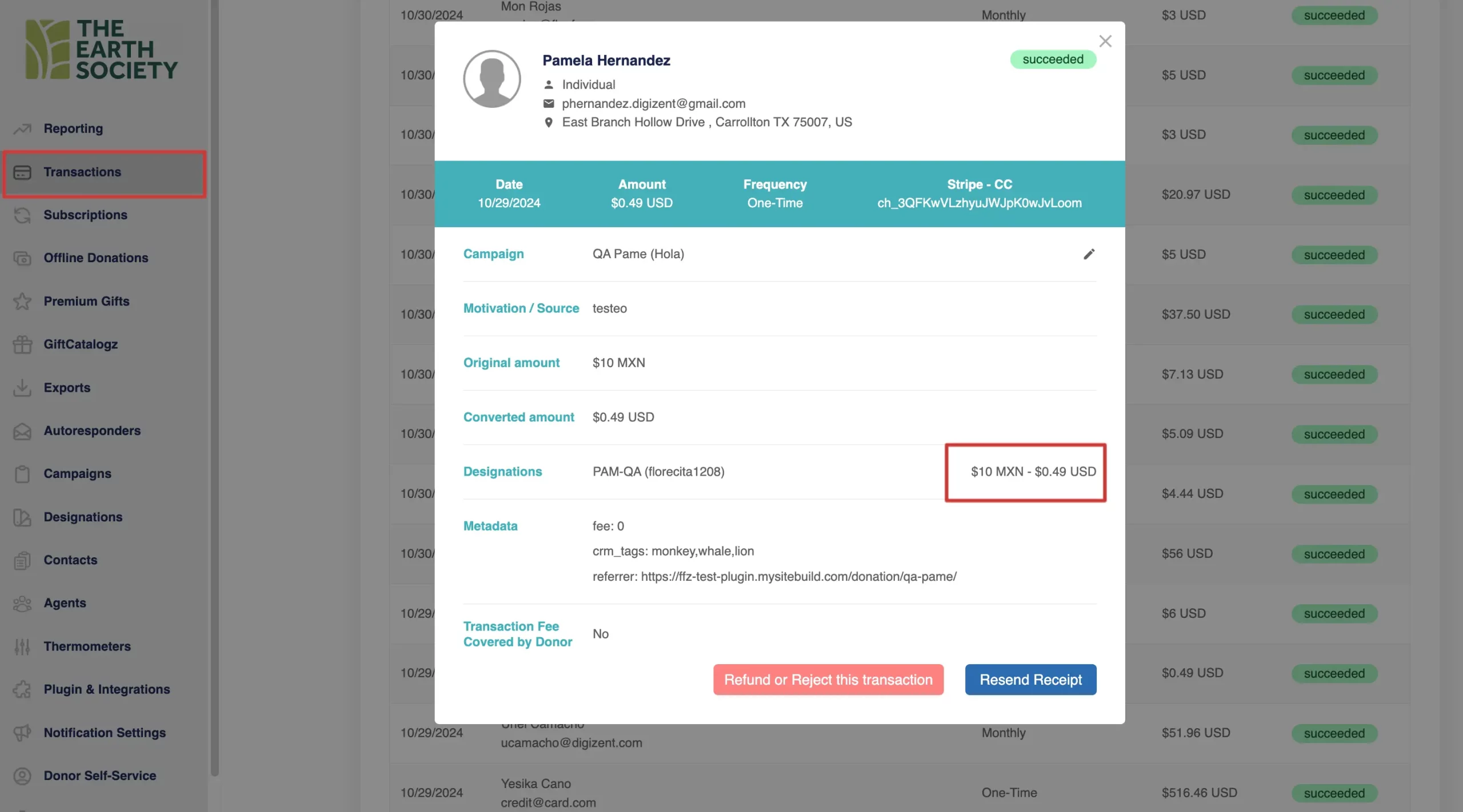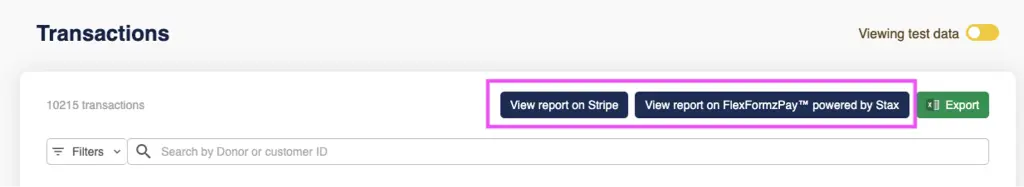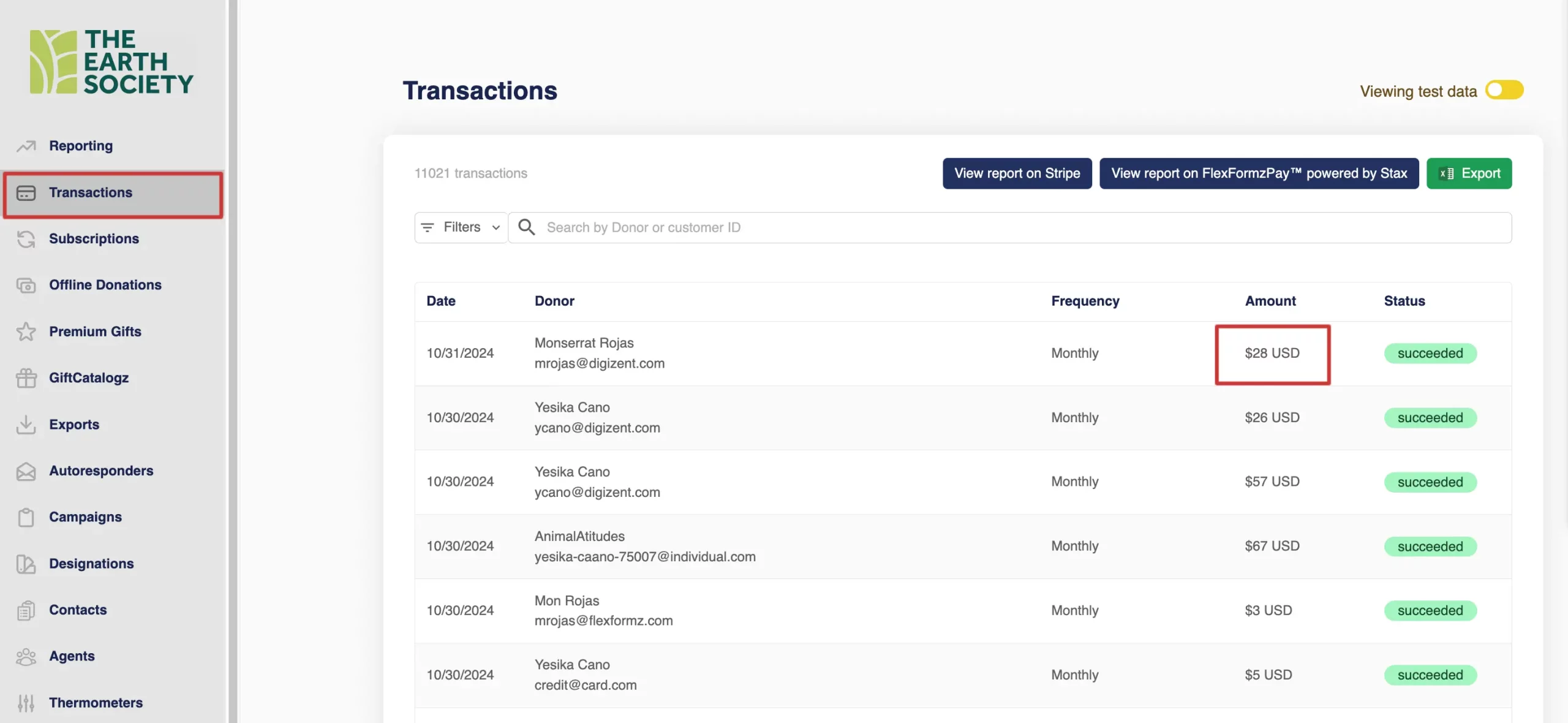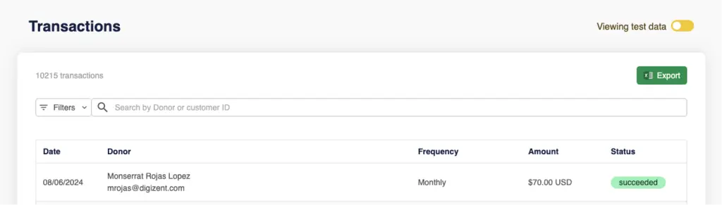 Users can view transactions, access transaction details, and search by donor and customer ID.