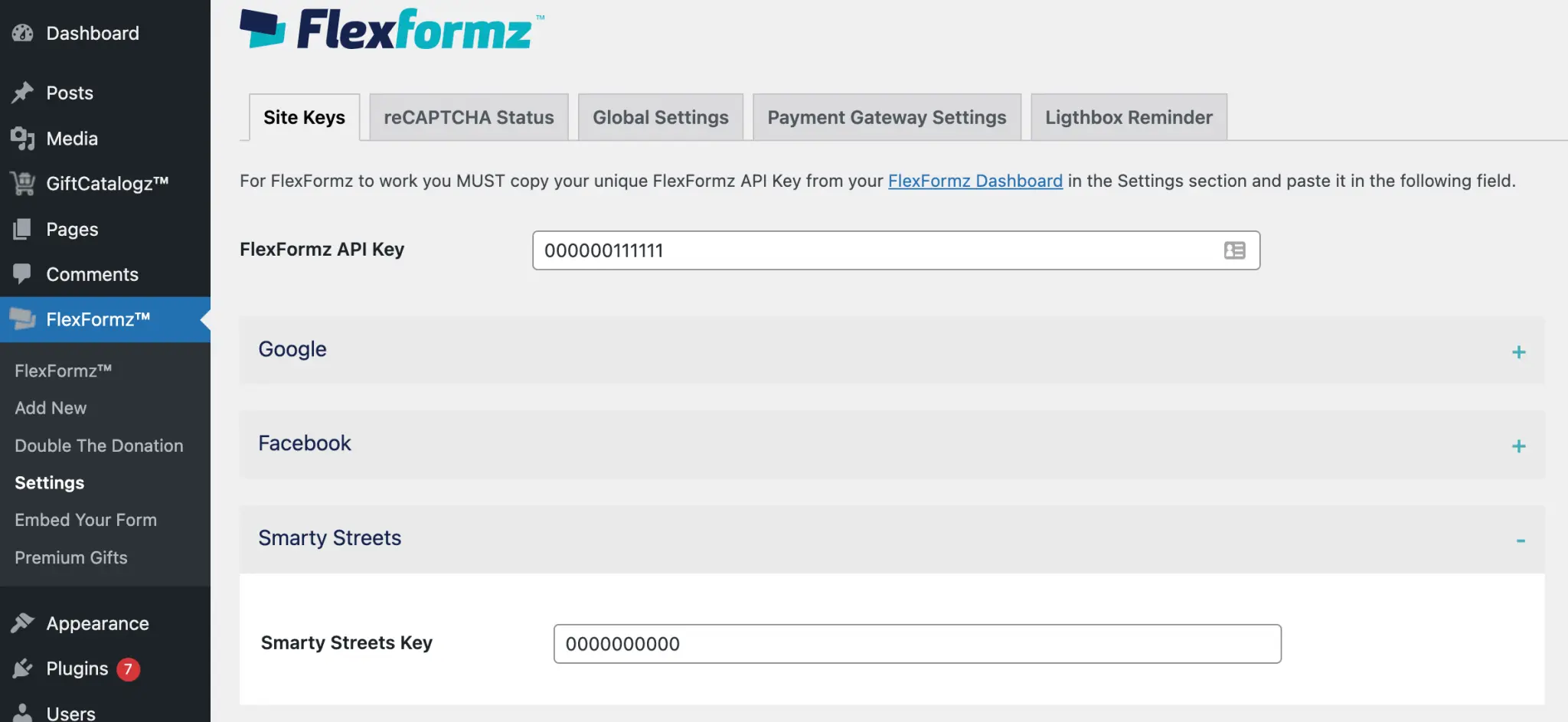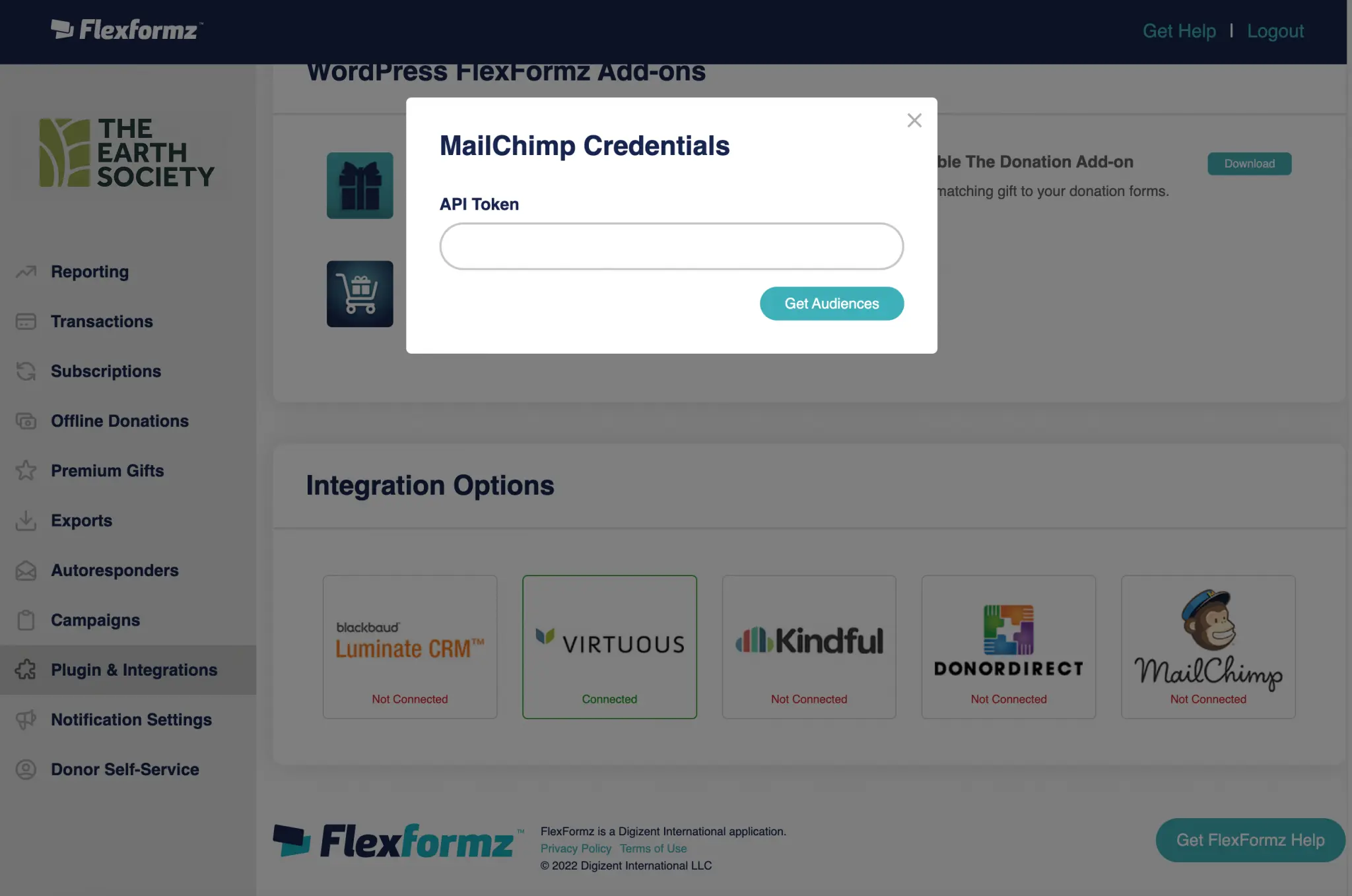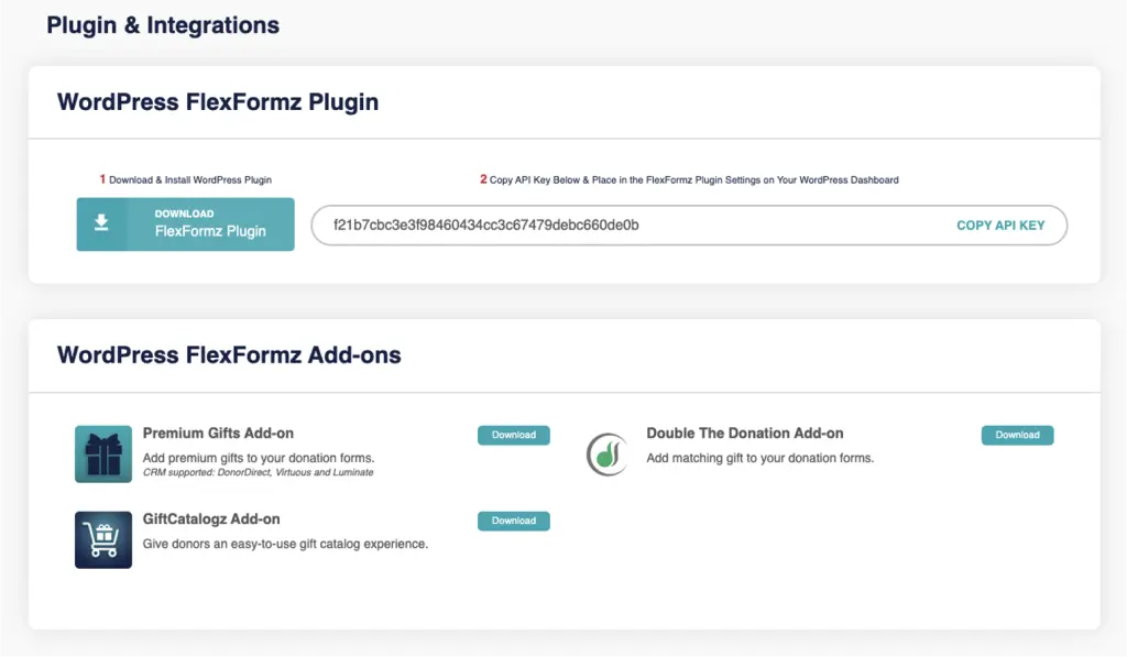 Users can view WordPress FlexFormz API Key and download the WordPress FlexFormz Add-ons.