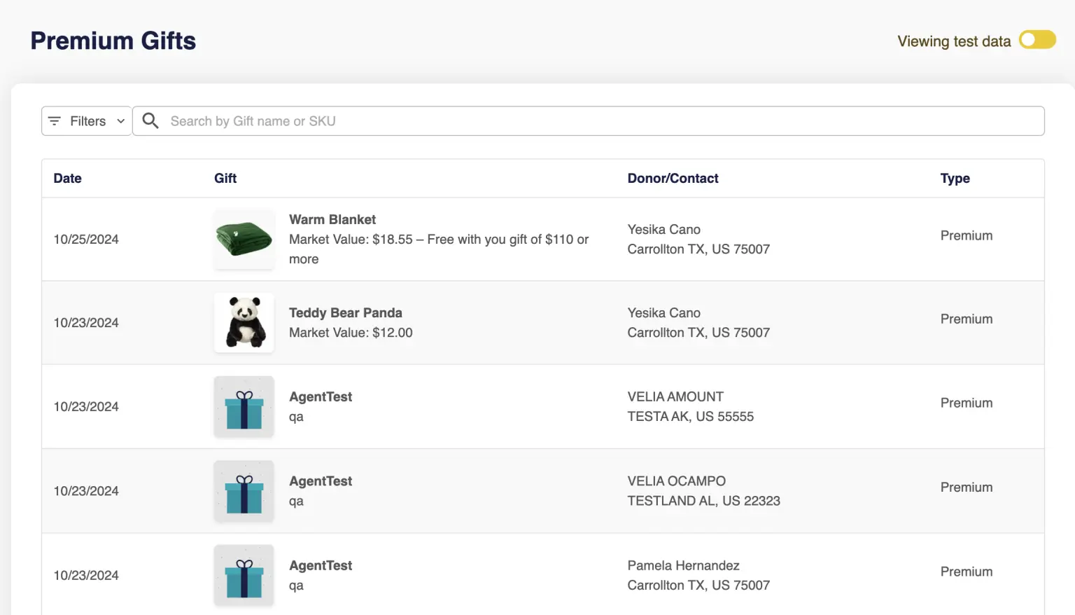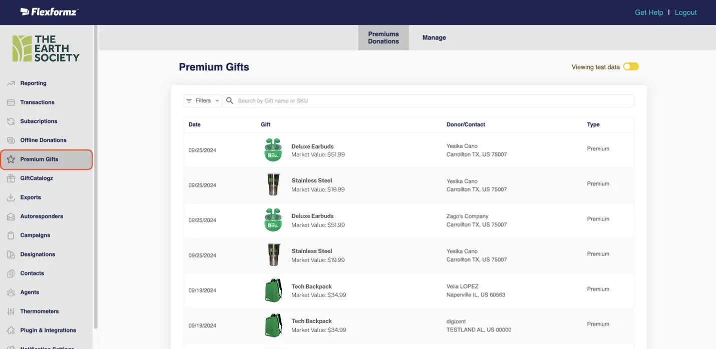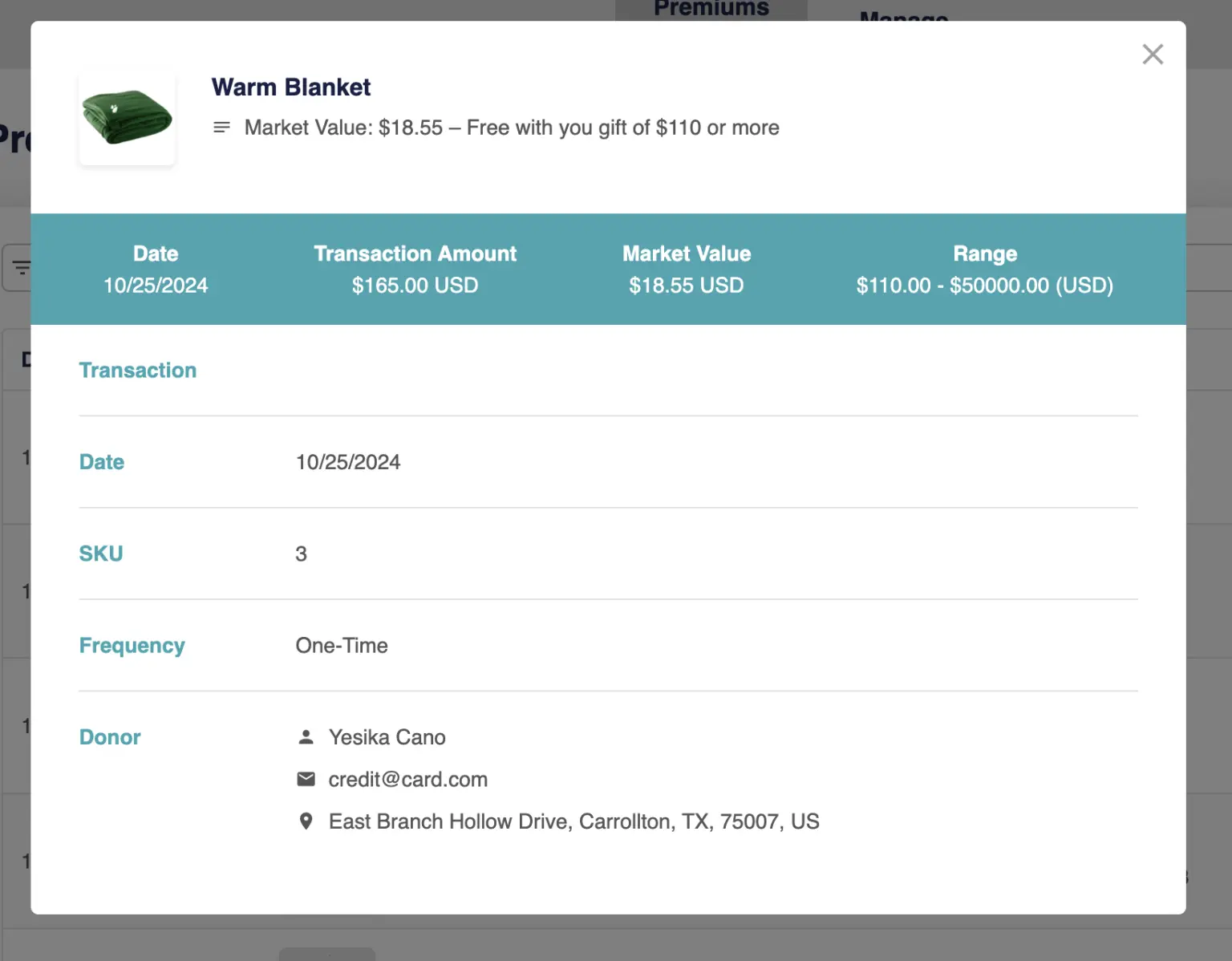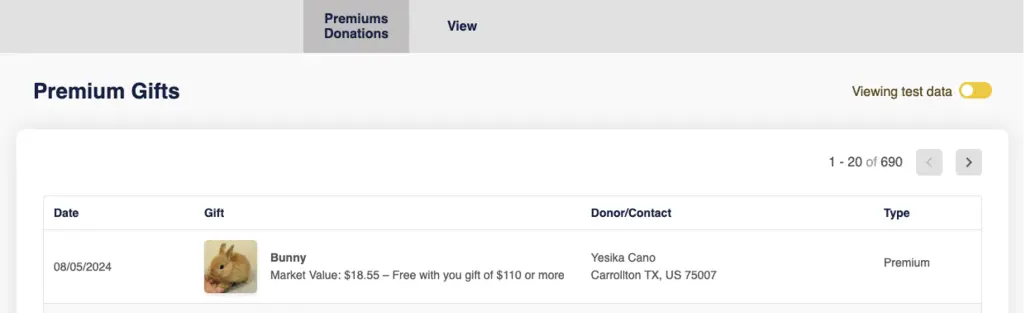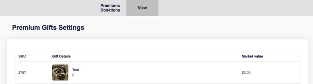 Users can view the premium donations and see information such as SKU, Gift Details, Market Value, etc.