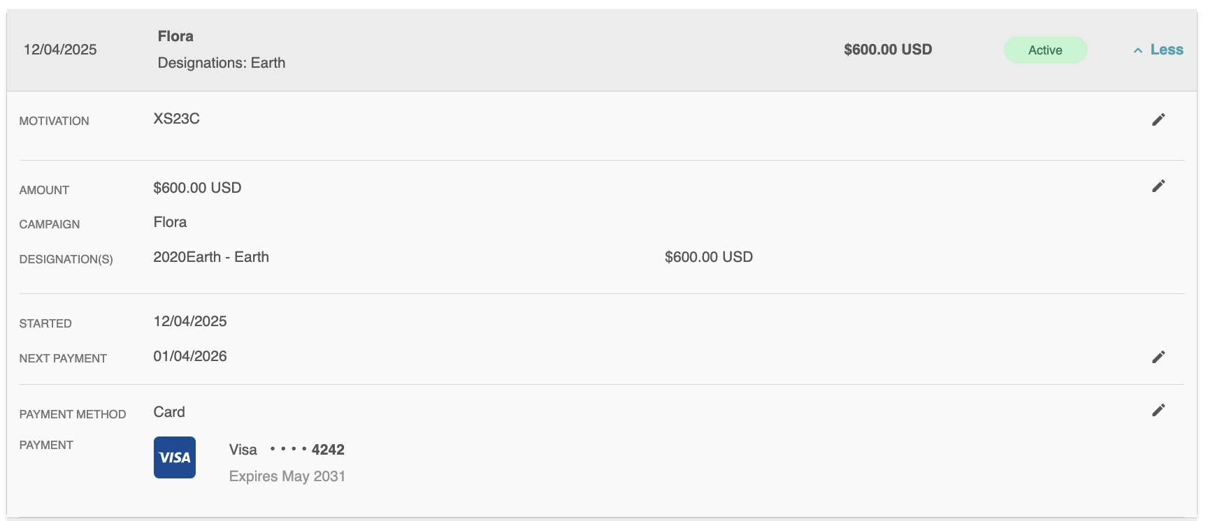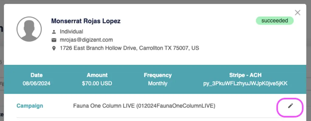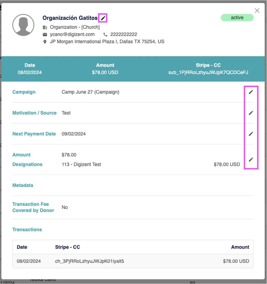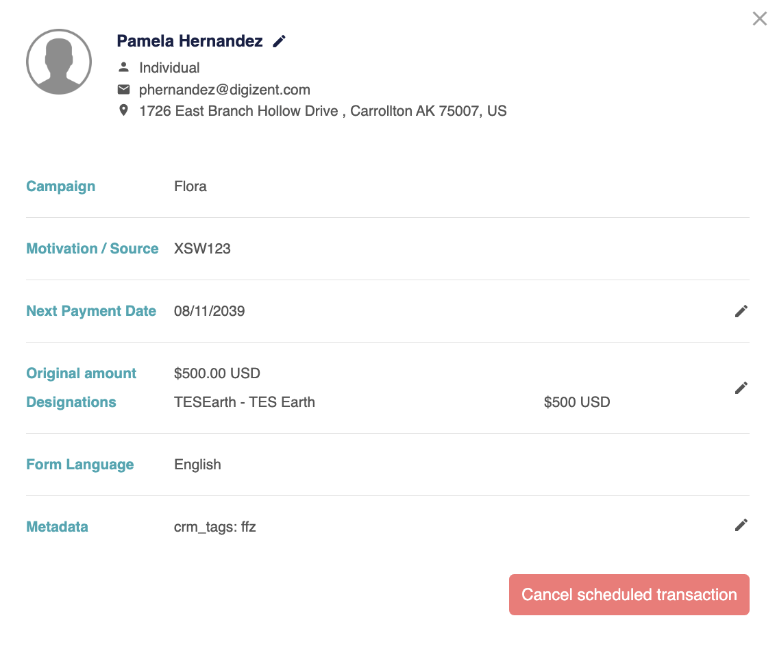 Users can edit the Name, Campaign, Motivation/Source, Next Payment Date, Amount-Designations, and view previous transactions.