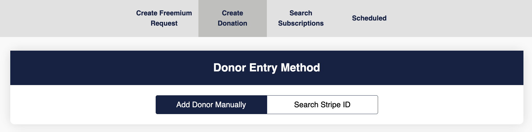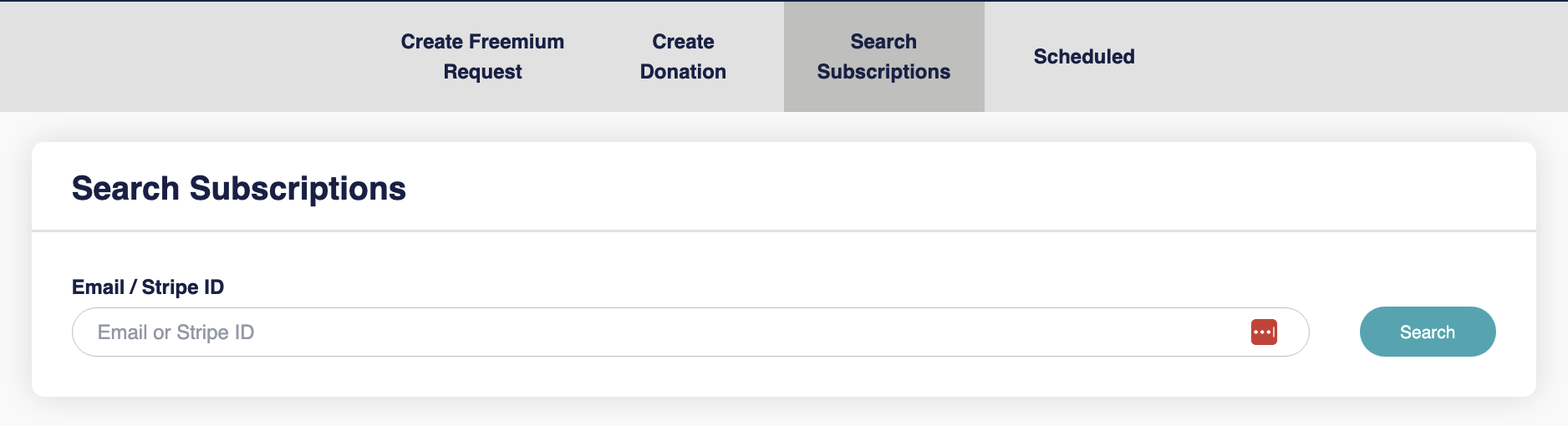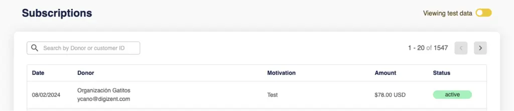 Users can view subscriptions and subscription details, search by donor, or search by customer ID.