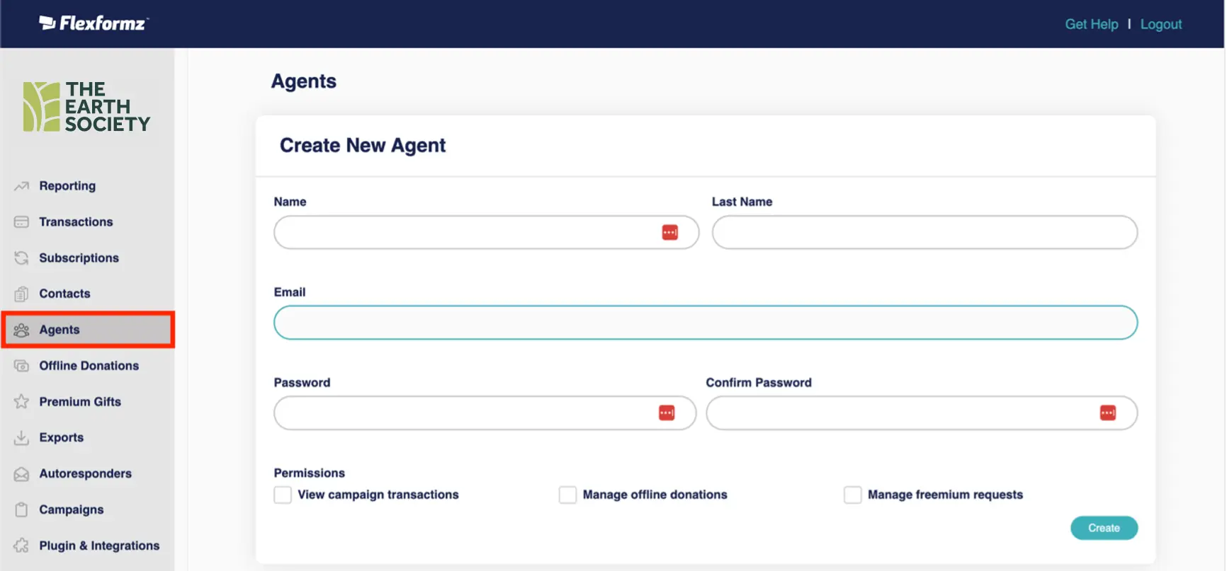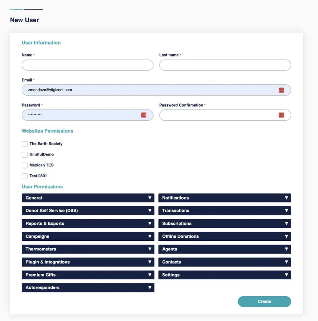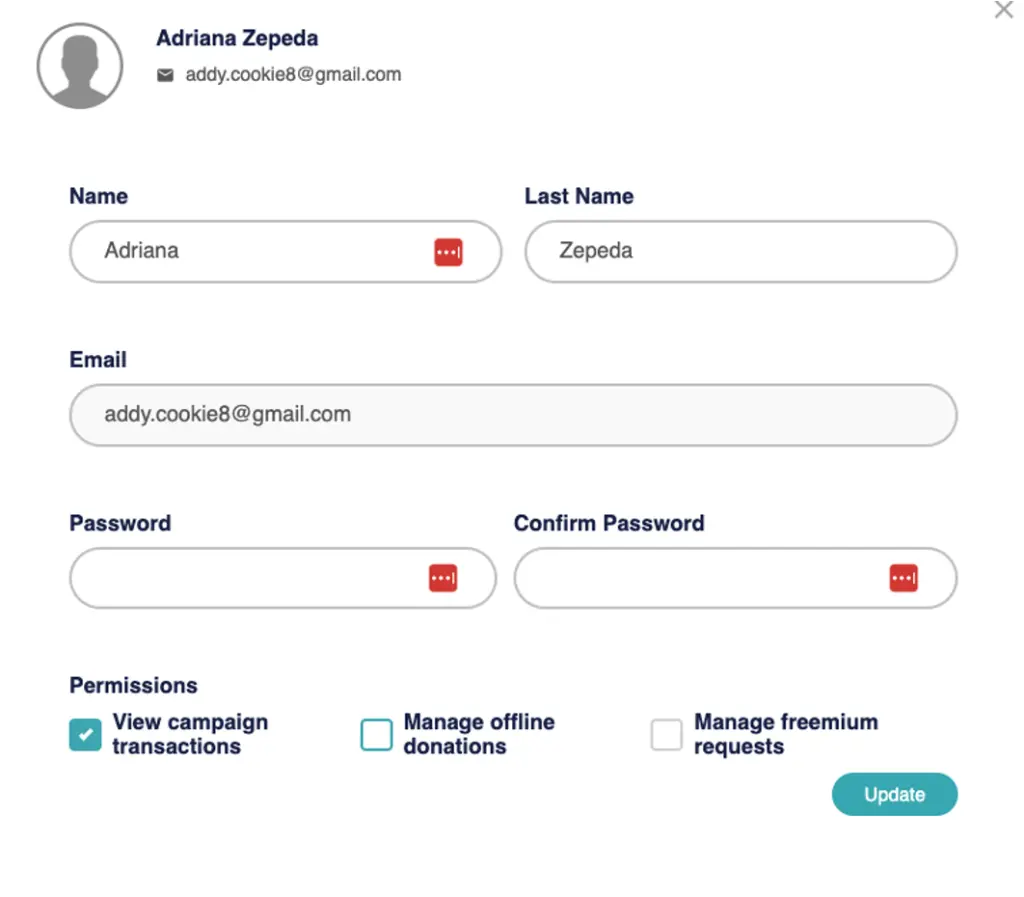 The required fields that must be filled in to create an Agent are: Name, Last Name, Email, Password, and Permissions. This last option gives each Agent different access to what they can or cannot do, such as viewing campaigns, managing offline donations, and managing freemium requests. Each created Agent can be edited and managed according to the organization’s needs.
