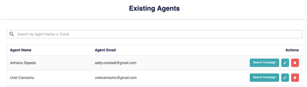 Users can create or delete agents, assign or remove campaigns, and edit the permissions or information for each agent.