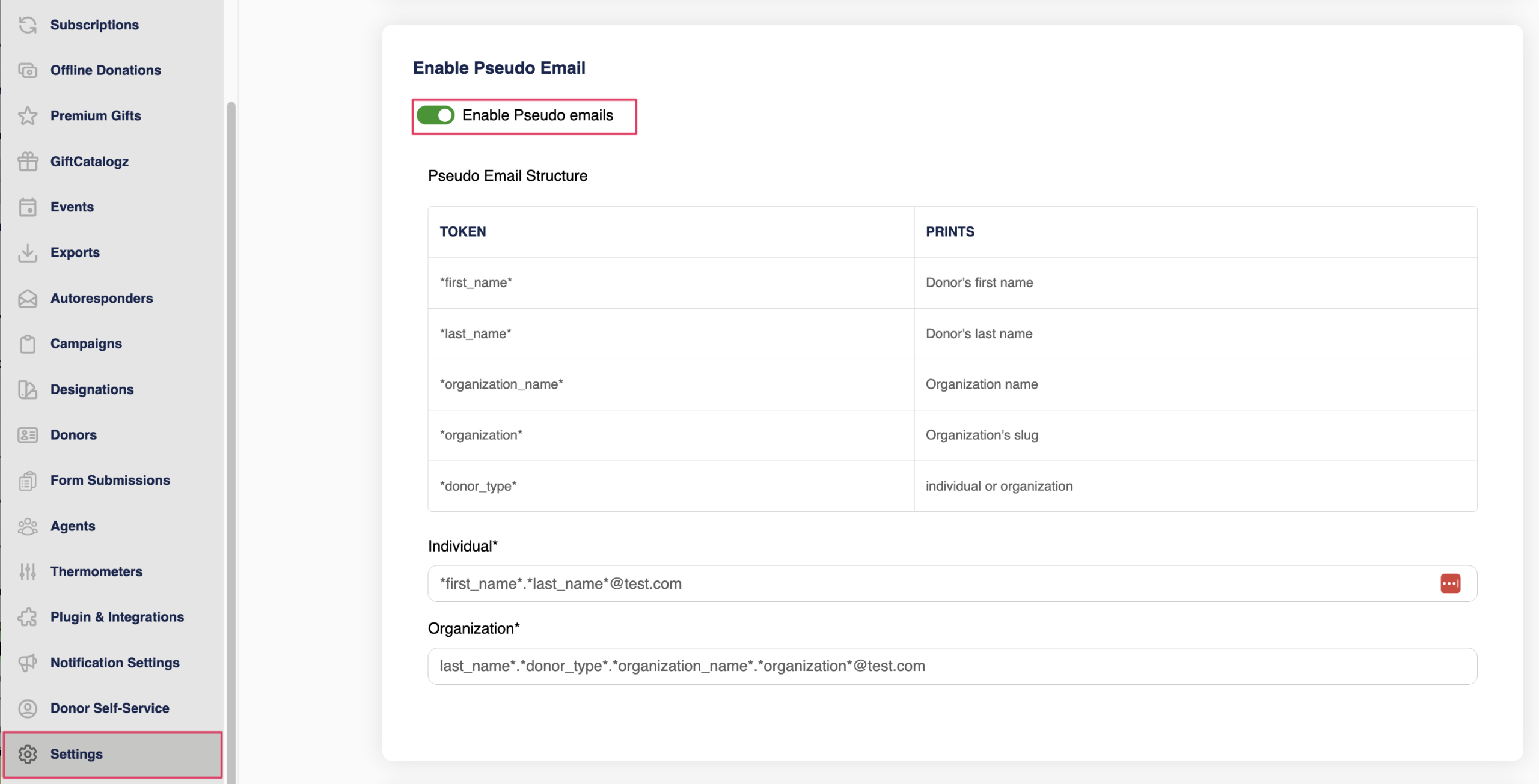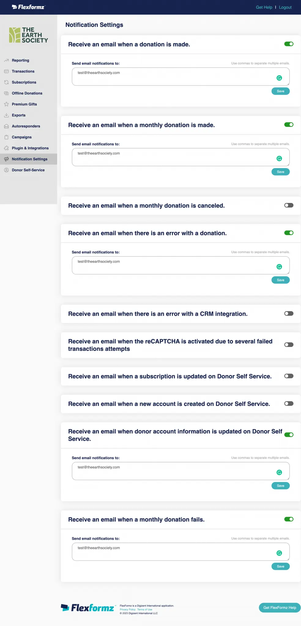 In the Notification Settings section there are 2 email notification options related to Donor Self-Service: