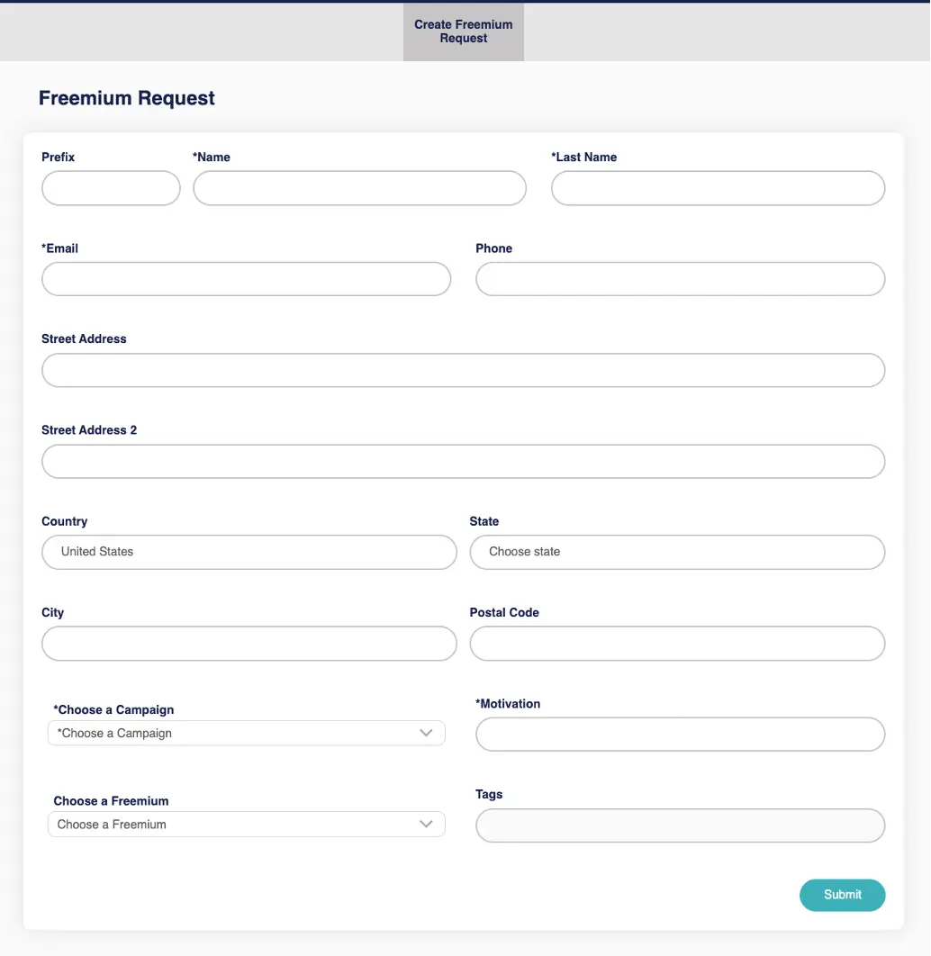 In the Agent login (if the Agent has the permission), the option “Create Freemium Request” will be shown on the top menu. This is a form to collect contact information.
