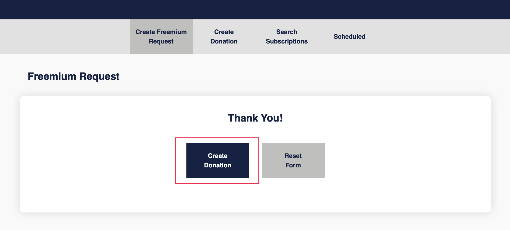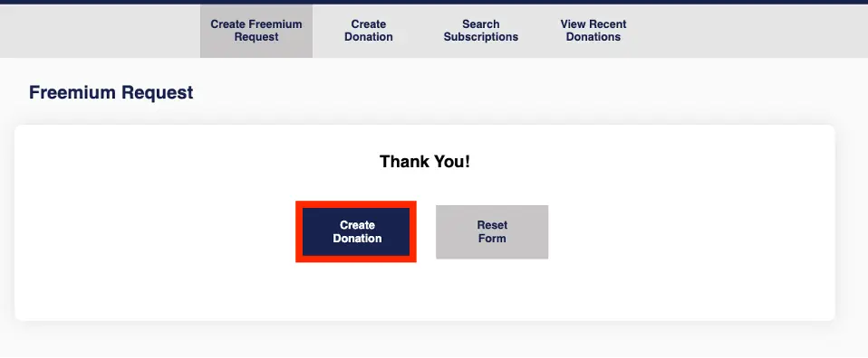 In the Offline Donations menu, the option “Create Freemium Request” is available only for Users with the permission “View Offline Donations”. If the Contact is made with an Admin account, it will display an error and the Contact can’t be submitted.