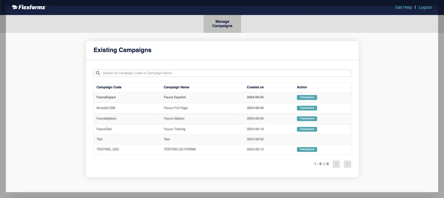 - View Campaign transactions: Allows the Agent to manage campaign results, use filters, and export those results for the assigned campaign. The view is similar to the one in the Reporting section on the Dashboard but is limited to the campaign assigned to that Agent.