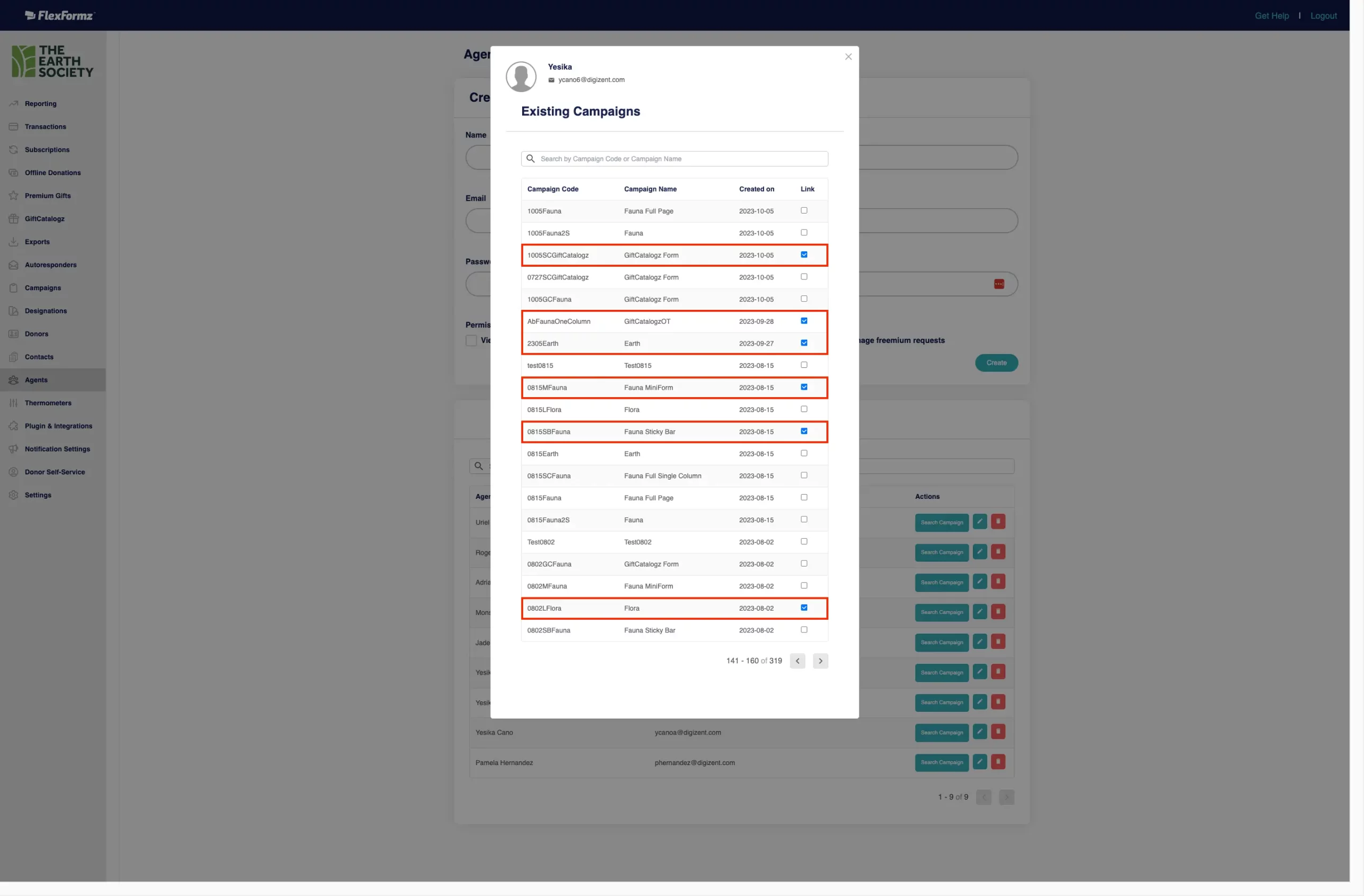 This will open a lightbox with all the campaigns. Search for and check the ones to assign to the Agent so they can see them on their profile.