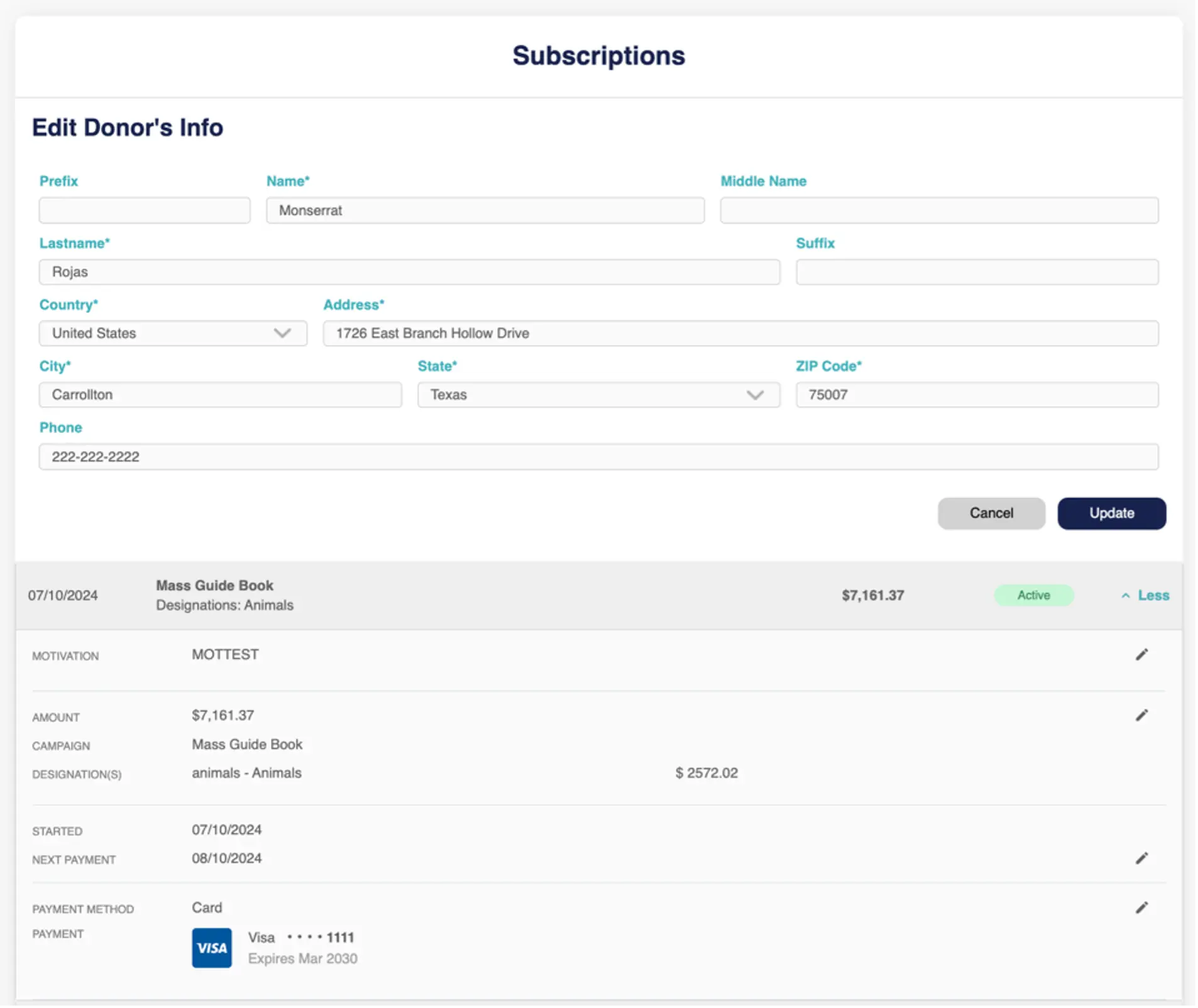 - Search Subscription submenu allows the Agent to search and edit active subscriptions. They are allowed to edit: Donor’s information, Motivations, Subscription amounts and designations, Next payment dates and Payment methods.