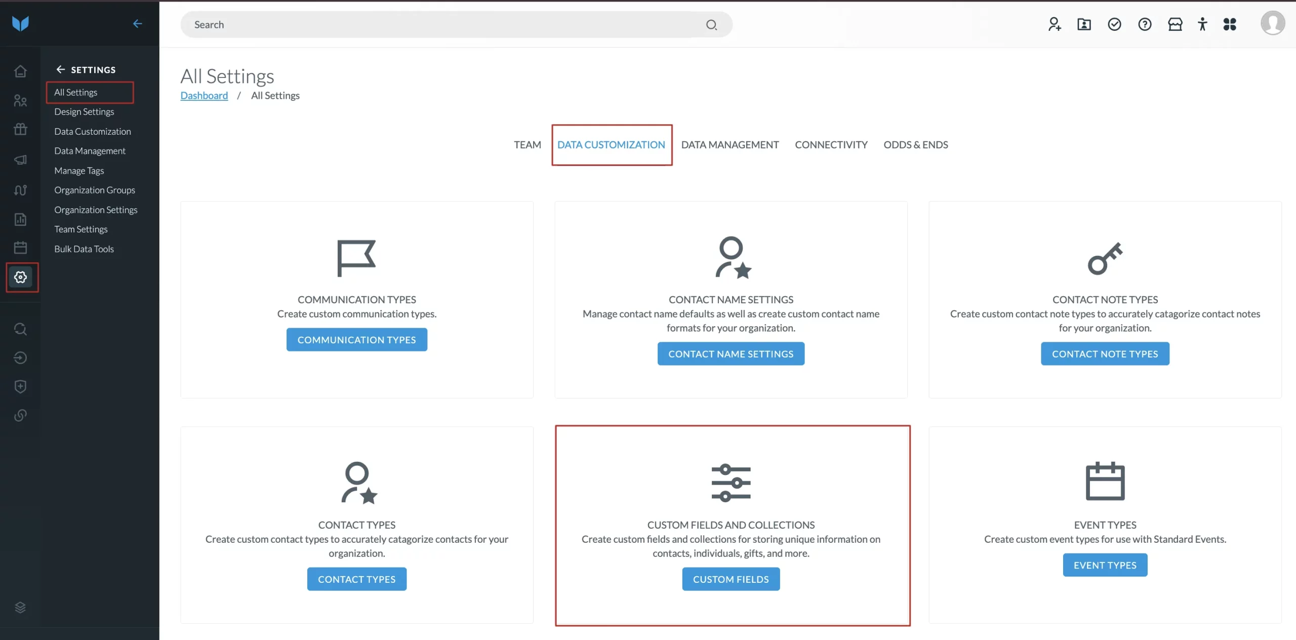 - In Virtuous, go to Settings -> All settings -> Data Customization -> Custom Fields and Collections.