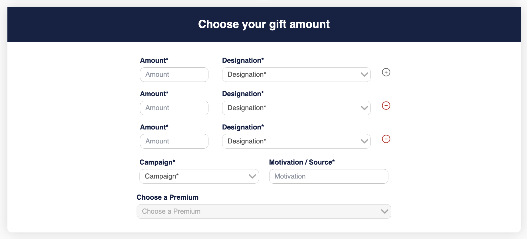 For an active recurring gift, the amount and designations can be updated. The donor can also split their current gift in multiple designations. The maximum amount of designations is three per recurring gift. The total sum of all designations must match the recurring gift amount in order to be able to be updated properly.
