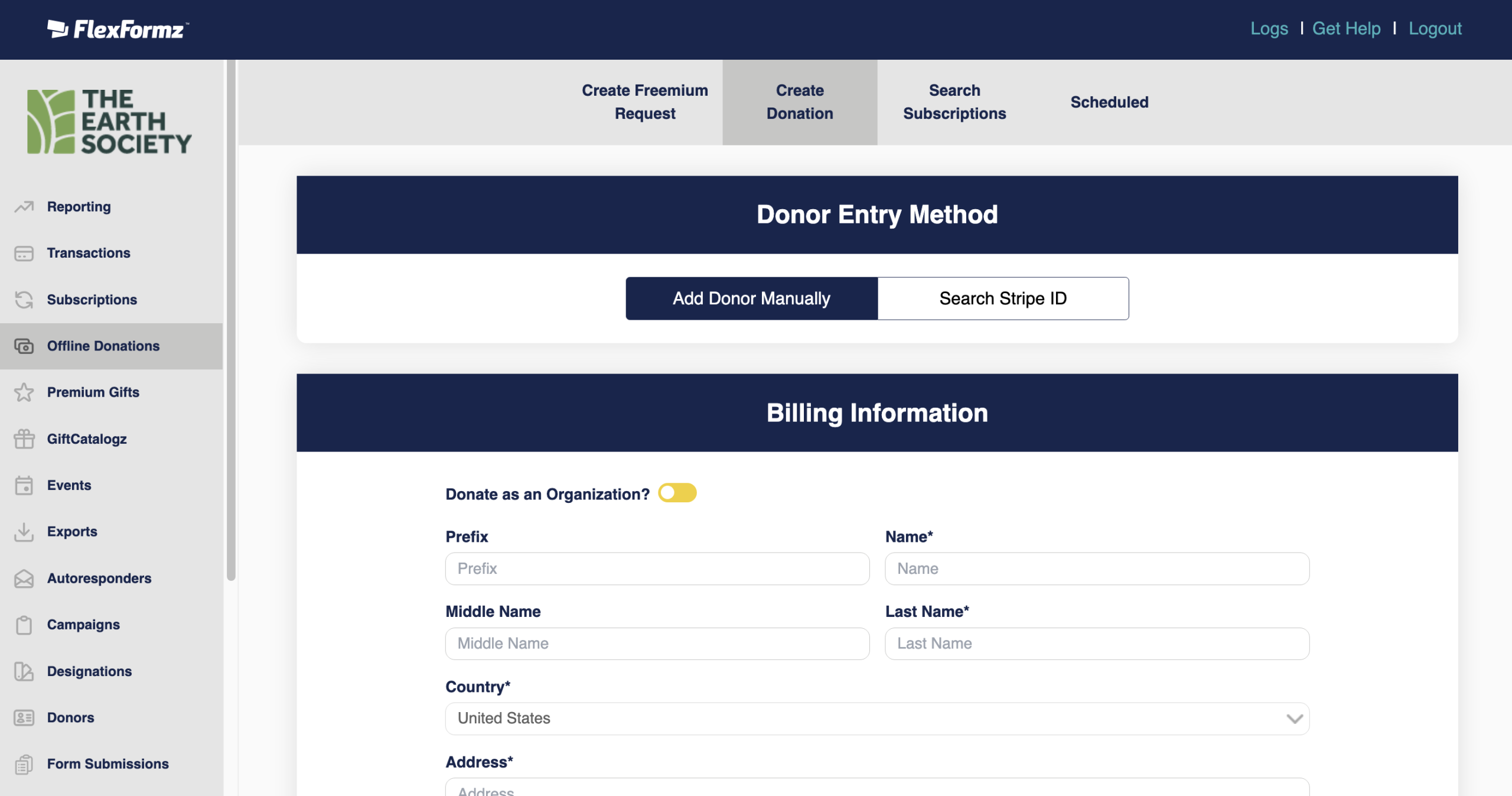 - Create Donation — enter one-time or recurring donations.