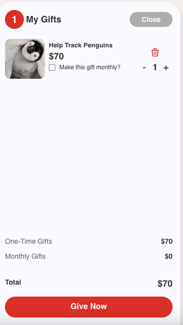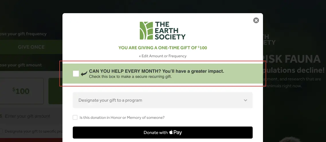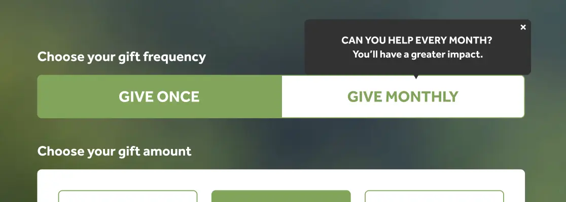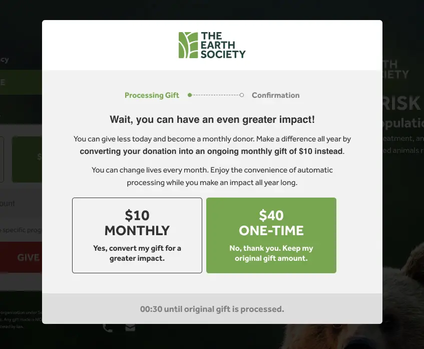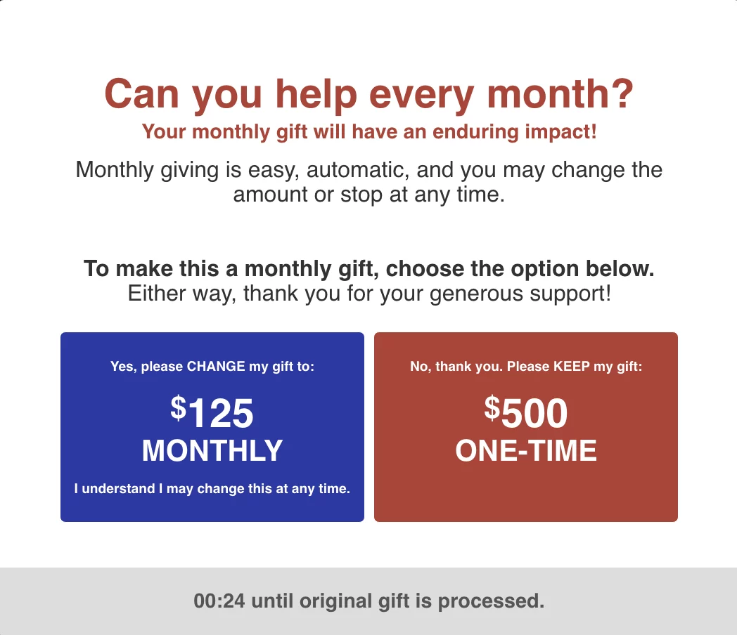 - Before the donation is finalized, the donor is offered the option to change their one-time donation into a monthly donation.