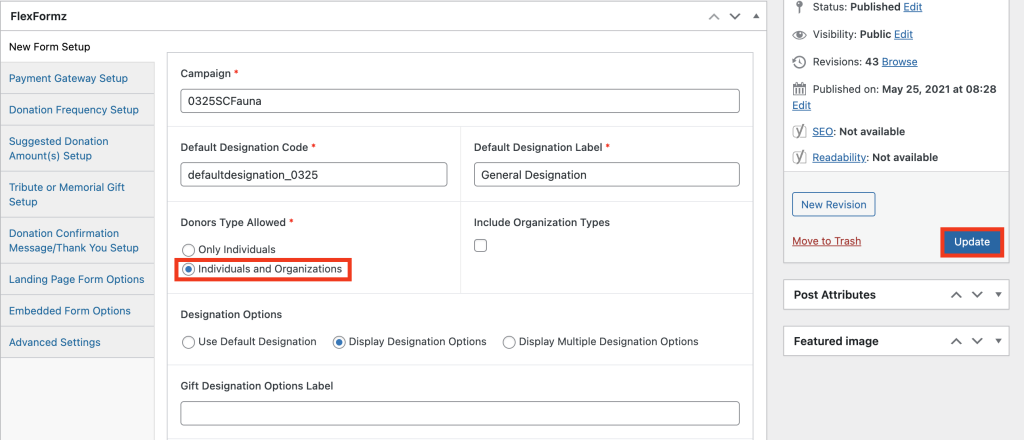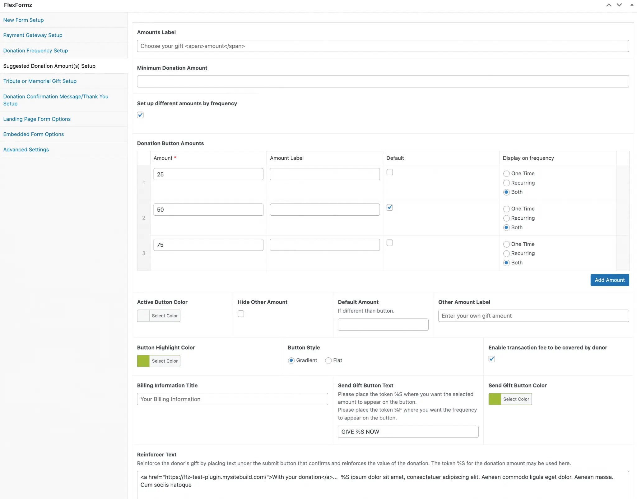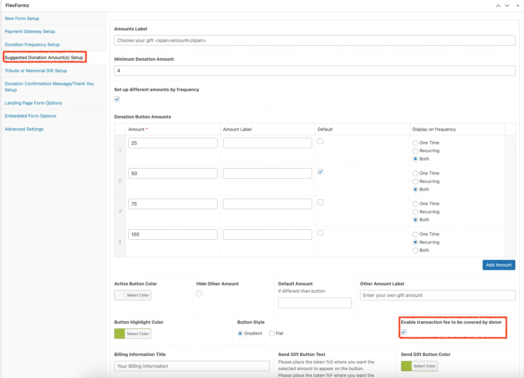 Importantly, custom amounts can be displayed based on a donor’s donation history, but note that it is only available in the full form (2-step, Two columns and Single column). It will calculate the average of the donor’s history, which will be taken as a base to use with the multipliers configurable in the general settings of FlexFormz.