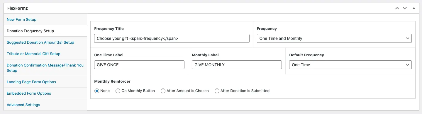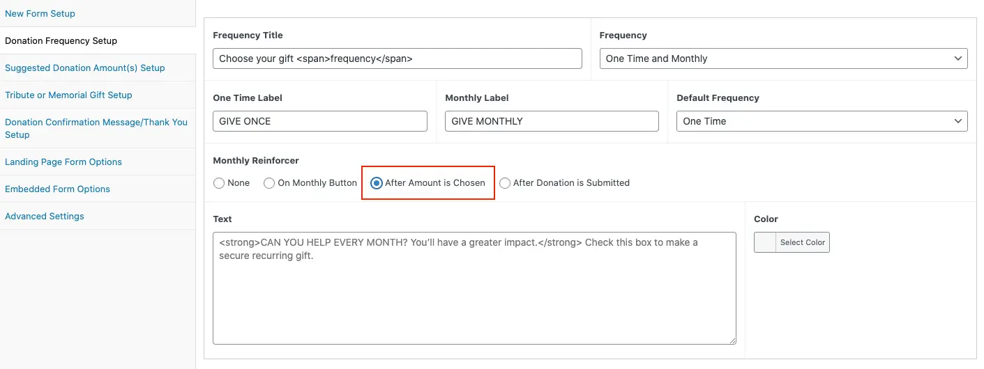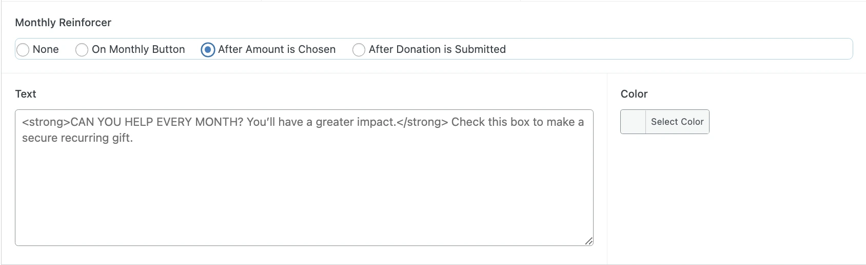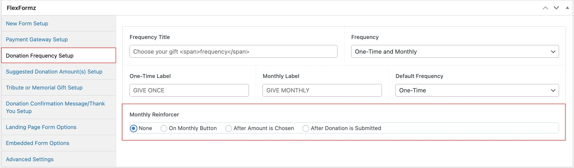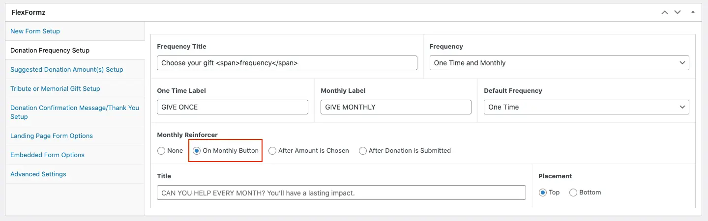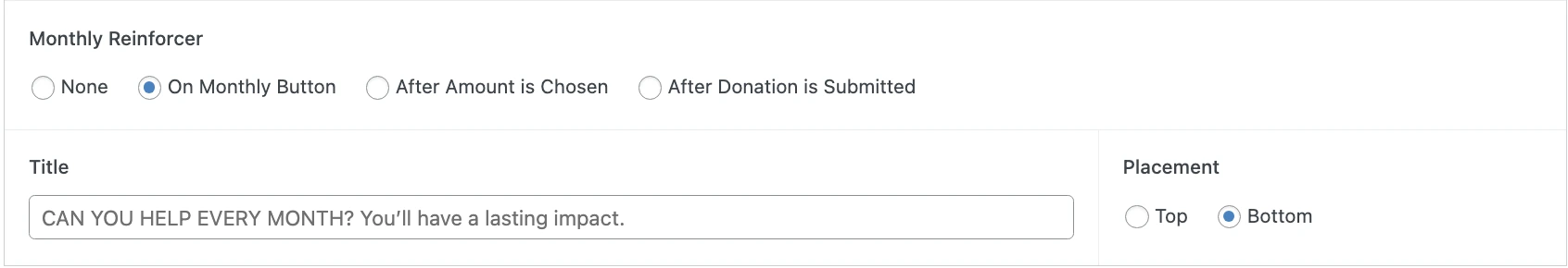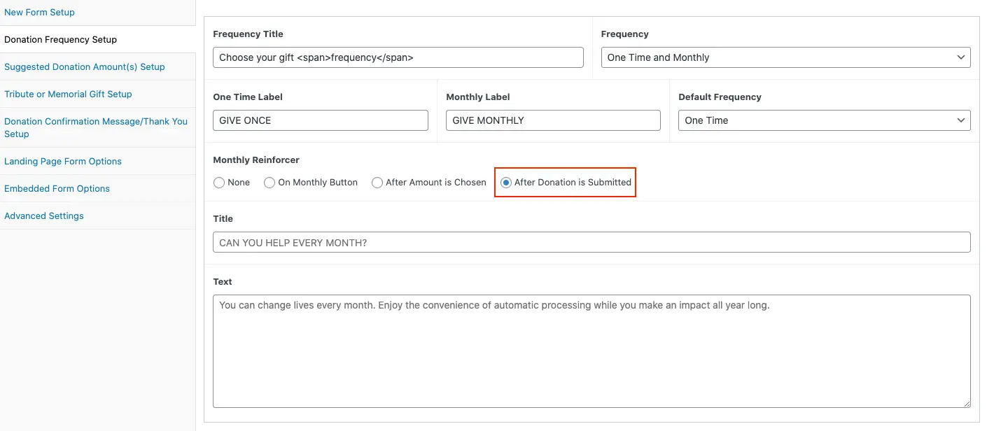 Monthly Reinforcer The Monthly Reinforcer is a feature designed to encourage donors who have selected a one-time donation to consider switching to a monthly donation. Configuration This option is available in the Donation Frequency Setup under Monthly Reinforcer.