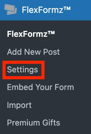 Inside the FlexFormz WordPress plugin, there are a few settings that you need to set up before creating your FlexFormz. When the FlexFormz plugin is installed and active, a new option is added on the left sidebar. Click/Tap on FlexFormz » Settings to access.