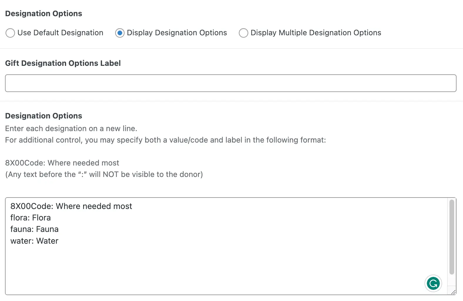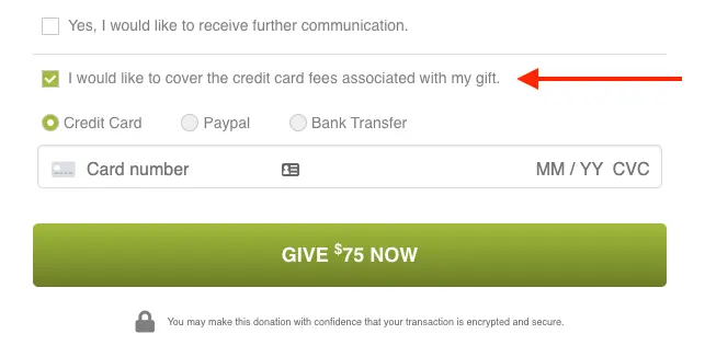 Enable transaction fee to be covered by donor. Select this checkbox to activate the option for your donor to cover the transaction fee.