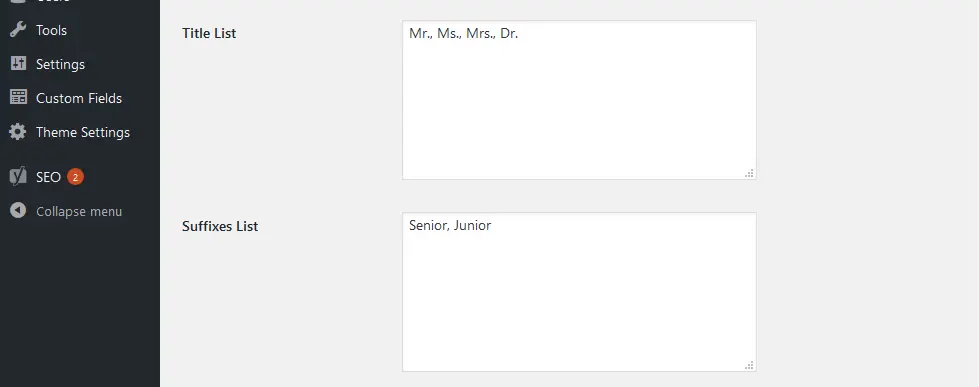 Insert all the Titles and Suffixes that you would like with each option separated by a comma.