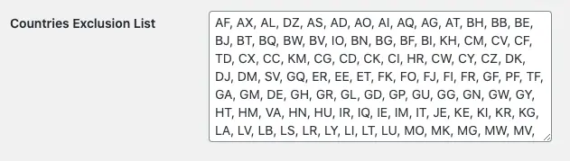 Add a list of countries you would like to exclude on your donation form by adding the 2 letter country code (Alpha-2 code), each on separated by a comma.