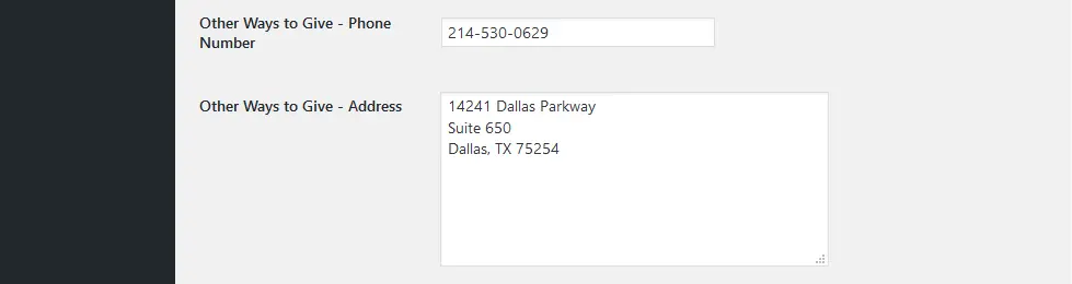 You can display a phone number and/or an address so that donors know how to contact your organization if they do not wish to give online. These options will be displayed only if you add the information to the “Other Ways to Give” phone and address fields. You may also add a legal disclaimer if you wish; just add the desired text to the field. It is blank by default.
