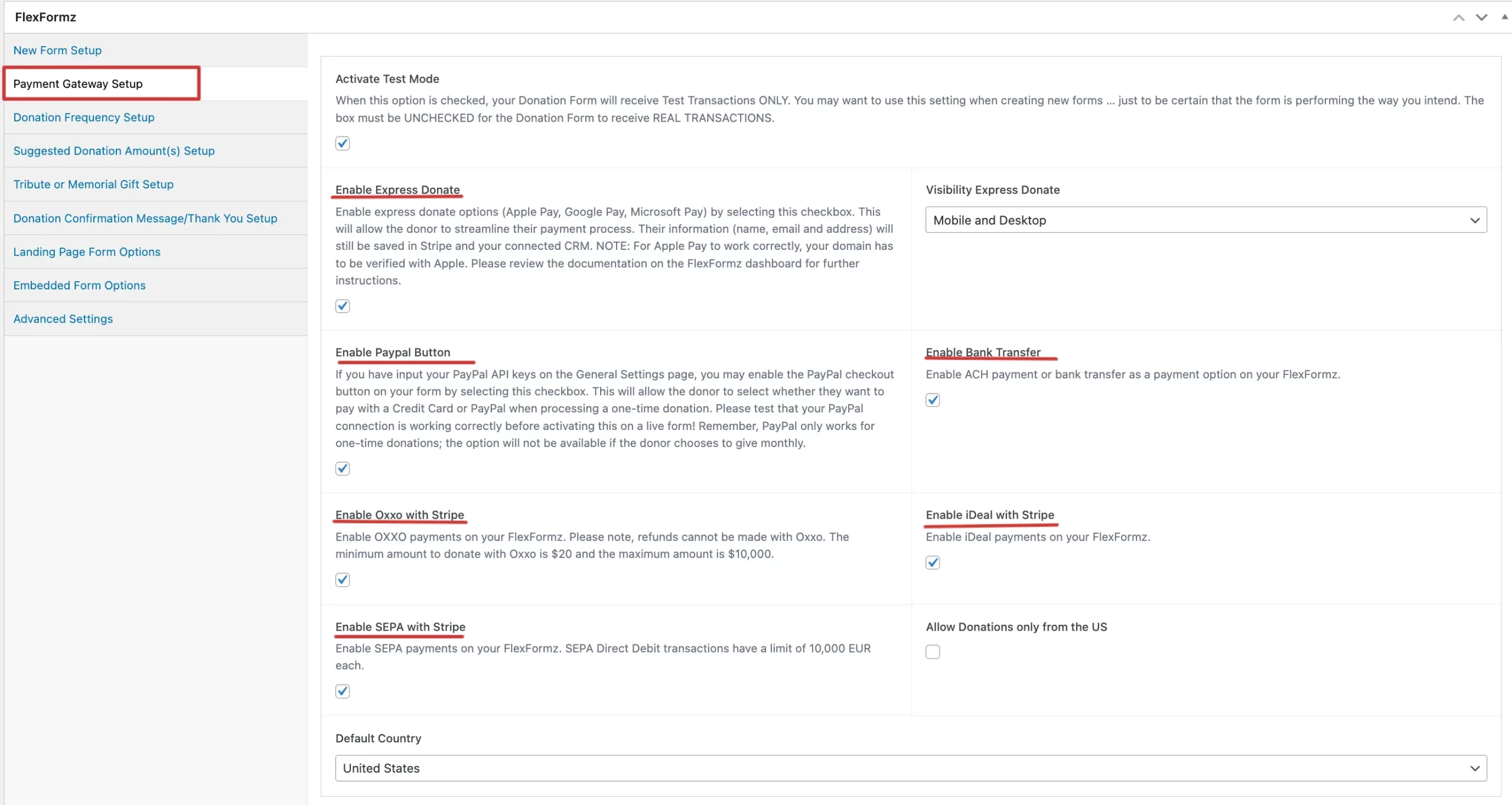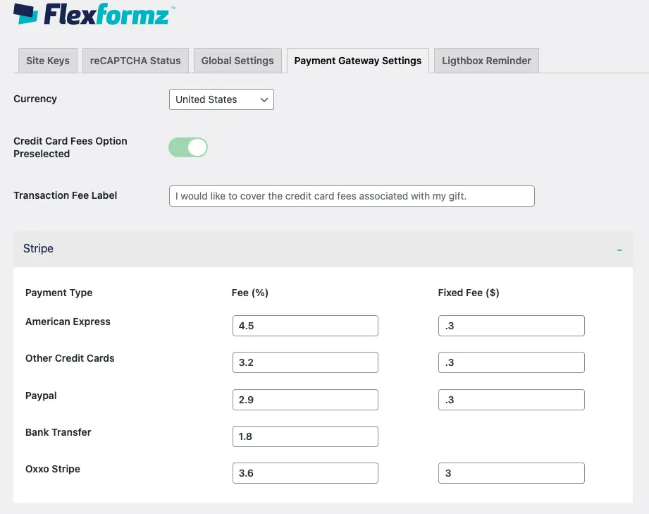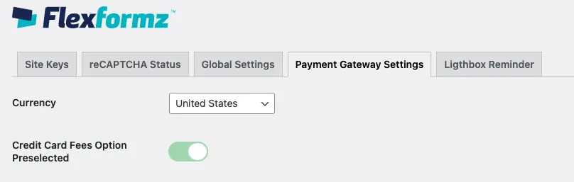 Go to the FlexFormz settings inside WordPress and at the bottom of the page, you will see the section Payment Gateway Settings. Check the Credit Card Fees Option Preselected to activate.