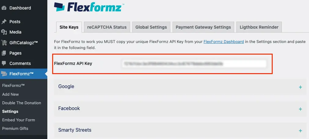 For FlexFormz to work you MUST copy your unique FlexFormz API Key from your FlexFormz Dashboard in the Plugin & Integrations section and paste it in the FlexFormz Settings inside the Site Keys tab of the FlexFormz WordPress plugin.