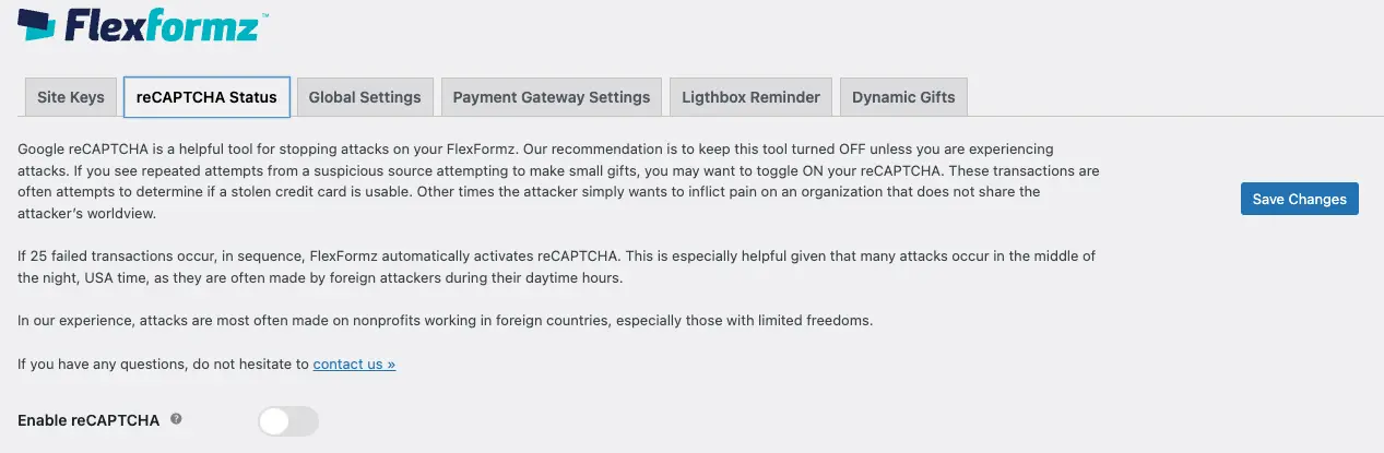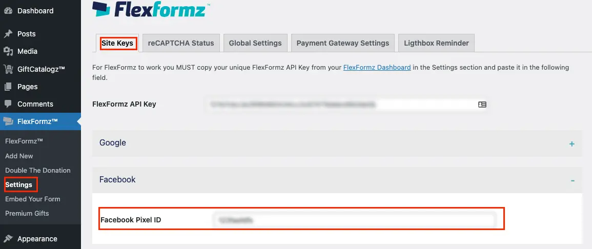 - Now log into your site go to the menu FlexFormz -> Settings, and paste the Google reCAPTCHA Keys.