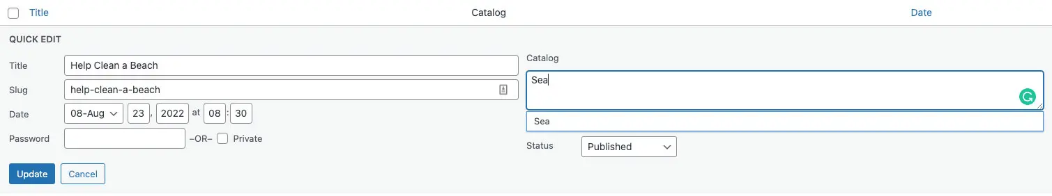 In the Catalog section, check the box labeled “Is this an event?” to categorize it as an event. Once selected, additional fields will appear to enter event details.