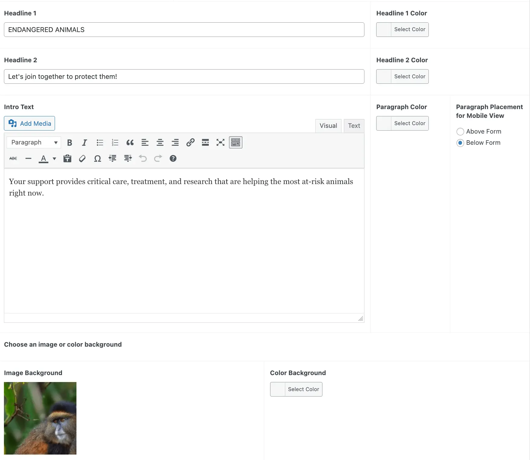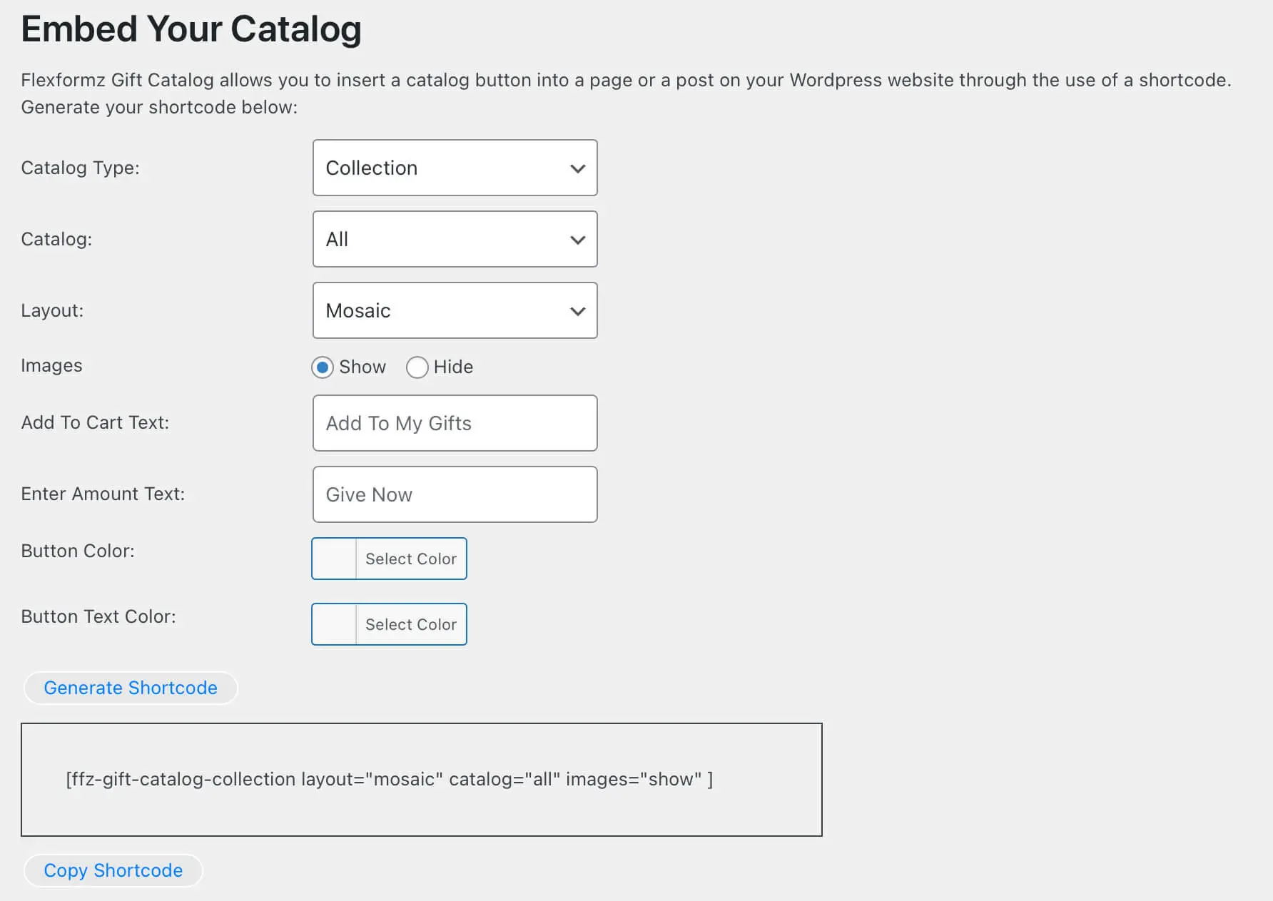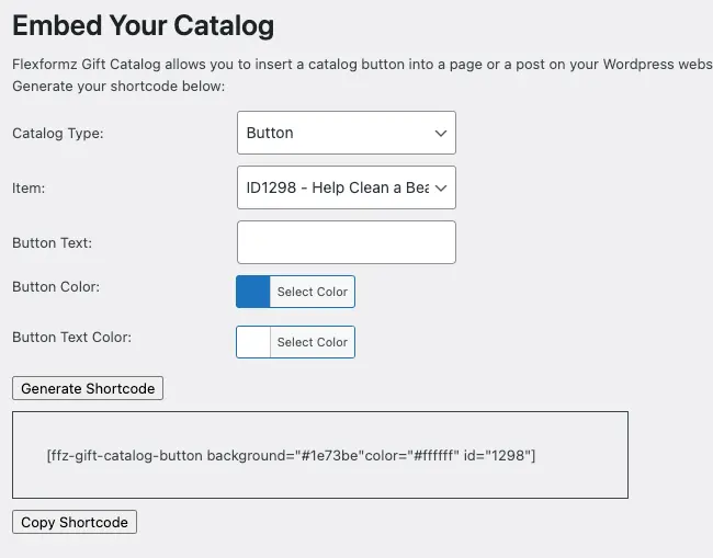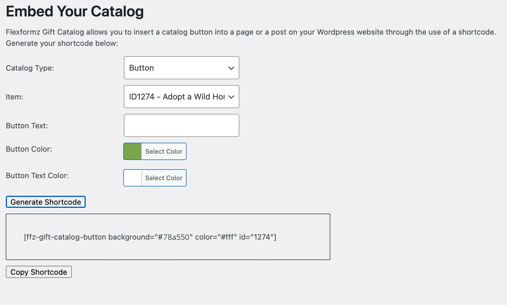 When the shortcode is generated, you can choose colors for the text and background of the button. |