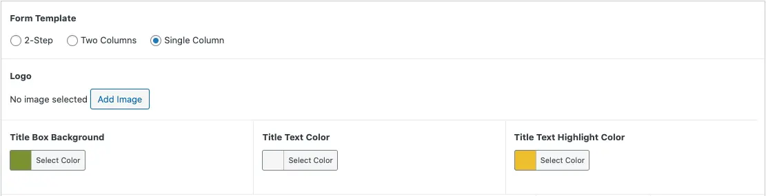 You can set a default logo; this logo will be displayed on the header of all the forms you create. Click/tap on the Upload button to open the WordPress media manager where you can select and upload your logo.