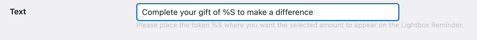 The default text is “Complete your gift of %S to make a difference”. If you change the text on this field, do not forget to use the token %S to display the amount that the user had originally selected.