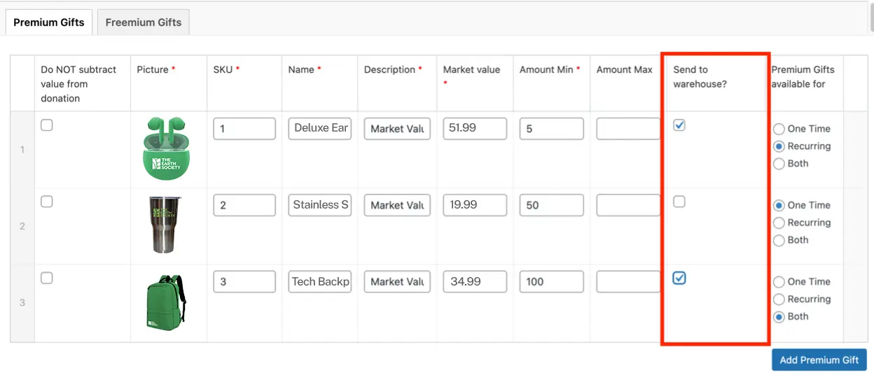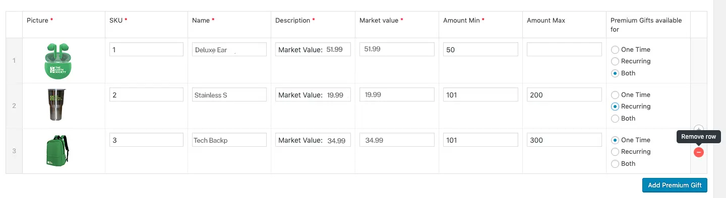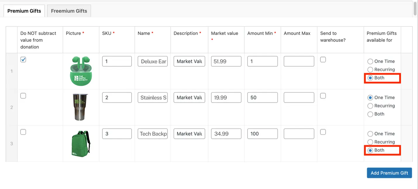With this flexible type of option, donors can choose the gift frequency for the item and they can change it any time through the Self Service Portal.