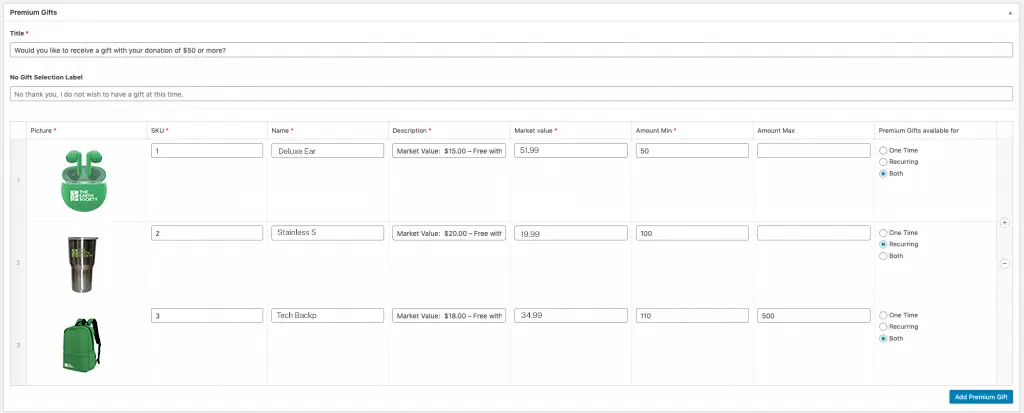 - It will not be shown if the donation includes a premium gift.