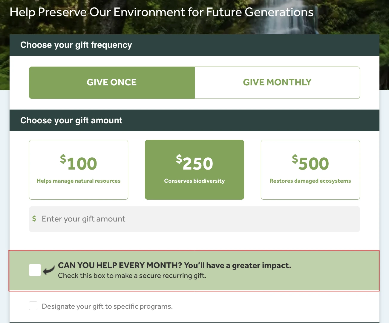 - Default title: “CAN YOU HELP EVERY MONTH? You’ll have a lasting impact.”