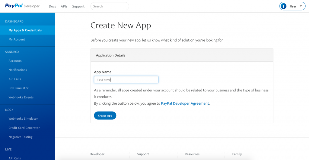 5. Click on the ‘Create App’ button. It will show you a page with the Application Details, please use FlexFormz Sandbox as the App Name. The Sandbox Business Account will be automatically generated. Click on the Create App button.