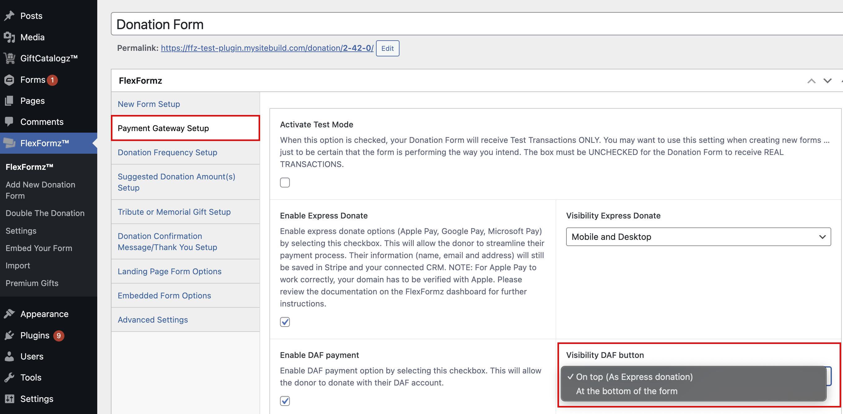 Important: If you disconnect DAF Pay from your Flexformz dashboard, donations will not be processed—even if DAF Pay is still active on the plugin side.