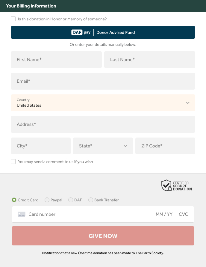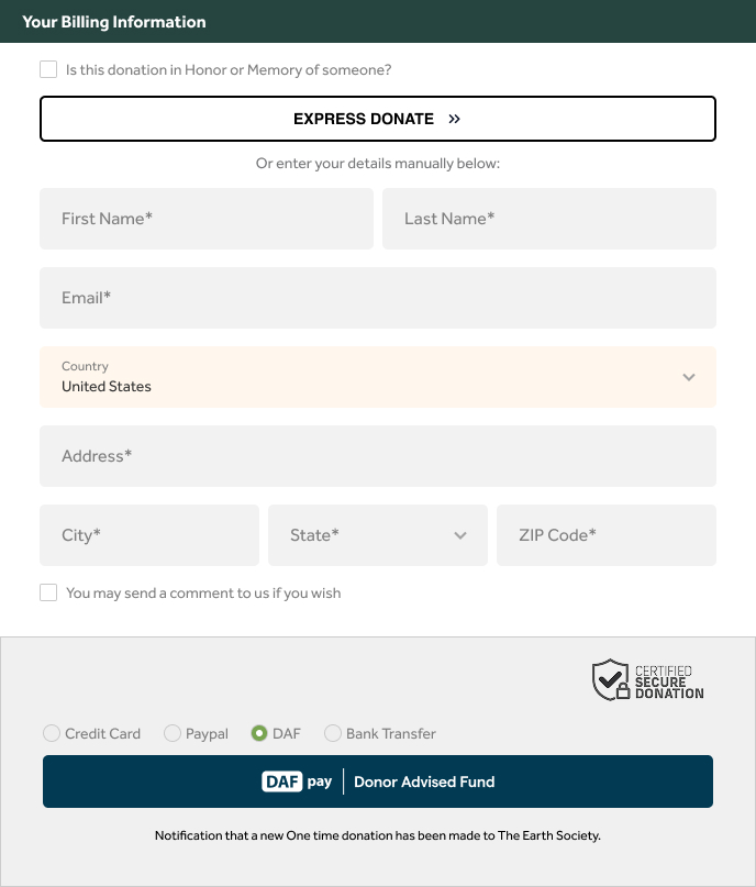 *DAF Pay only processes donations with a One-Time frequency because it cannot track upcoming charge dates for Monthly donations.