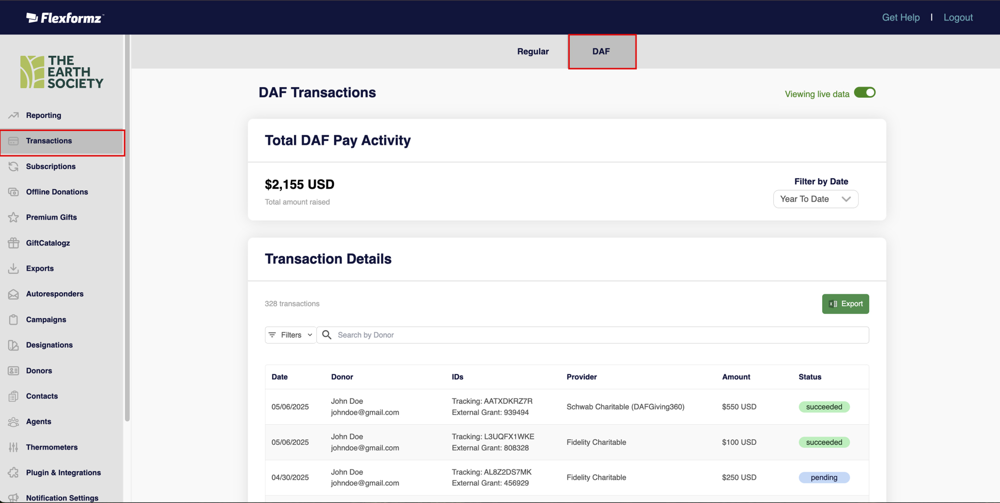 Under the Transactions section, select DAF to view a table with all donations made through DAF Pay.