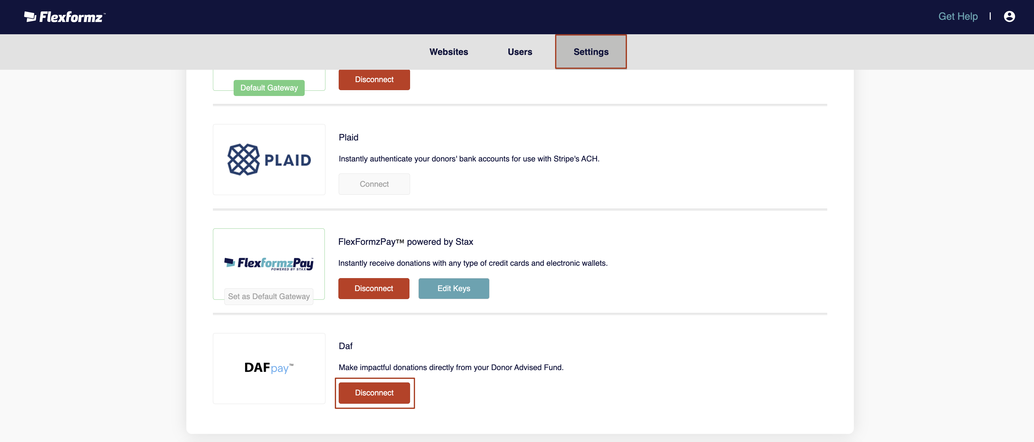 Important: If you disconnect DAF Pay from your Flexformz dashboard, donations will not be processed—even if DAF Pay is still active on the plugin side.